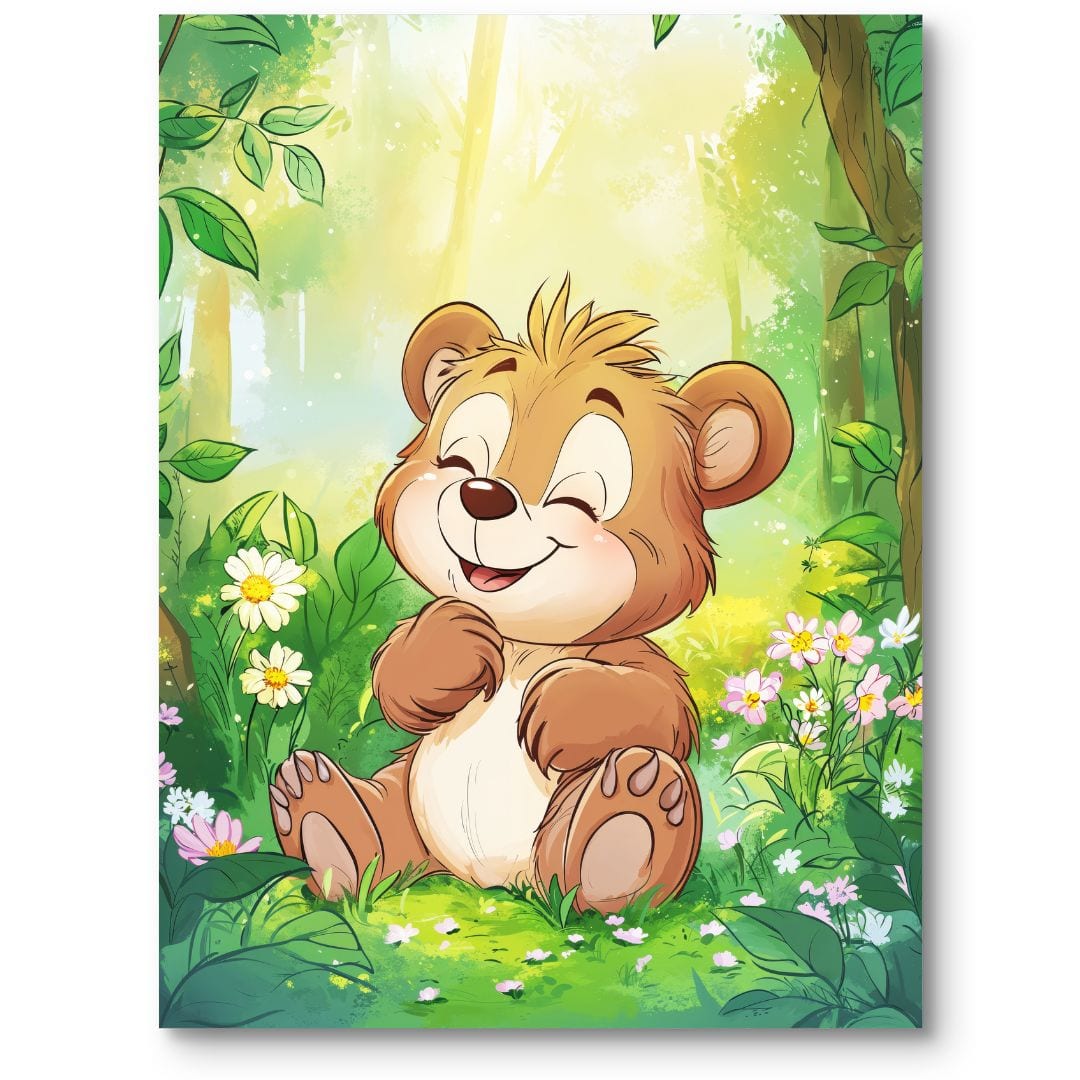 Plakat przedstawia uroczego, młodego niedźwiadka siedzącego pośród bujnej, zielonej przyrody. Uśmiechnięty miś z radością oddaje się chwili spędzonej w lesie, otoczony kwiatami i drzewami. Cała scena emanuje ciepłem i przytulnością, doskonale oddając czar dziecięcego świata — pełnego niewinności oraz beztroskiej radości.