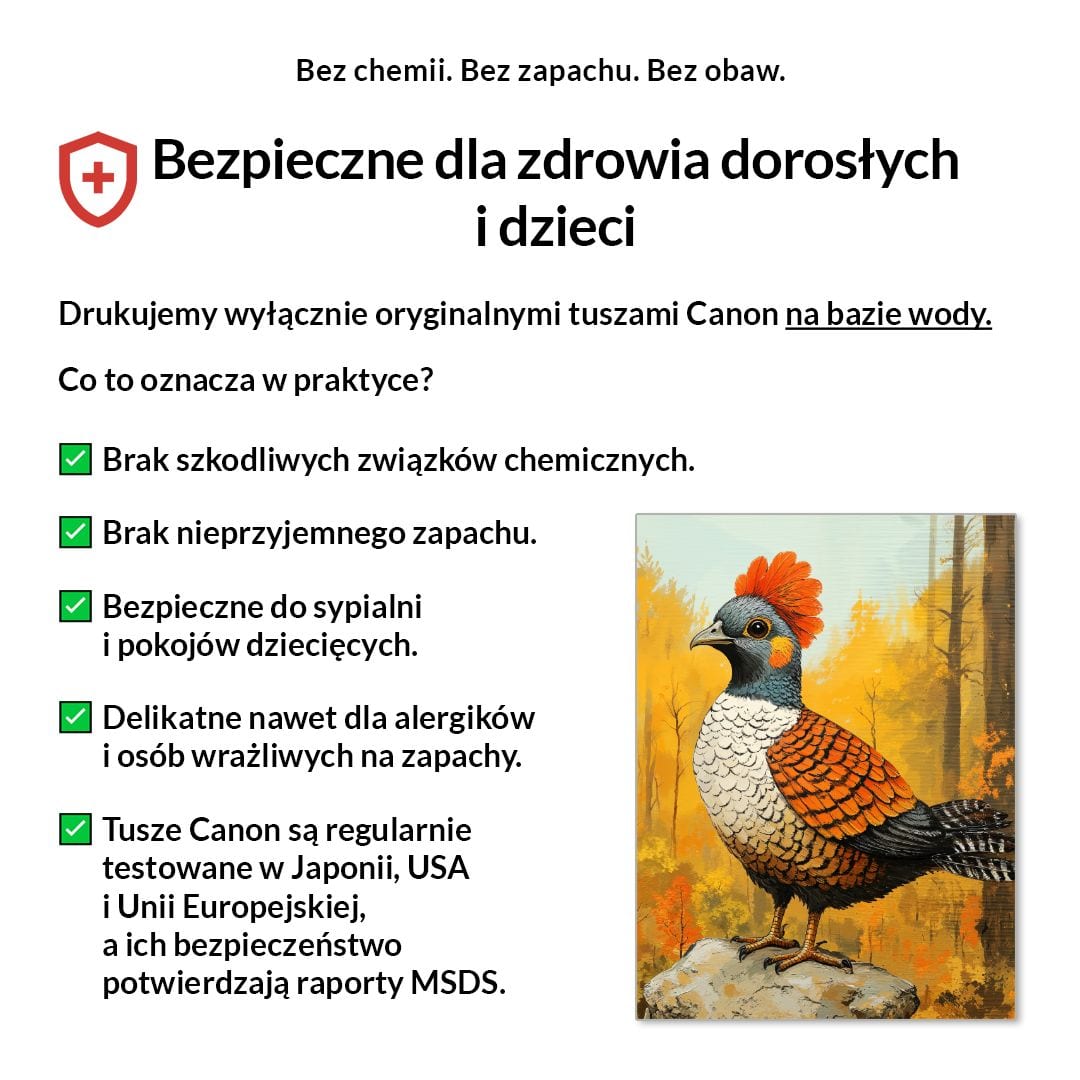 Tak, absolutnie! Drukujemy wyłącznie certyfikowanymi, bezwonnymi tuszami pigmentowymi Canon Lucia Pro na bazie wody. Są one w pełni bezpieczne dla zdrowia, nie zawierają rozpuszczalników i mogą być bez obaw stosowane w sypialniach i pokojach dziecięcych.