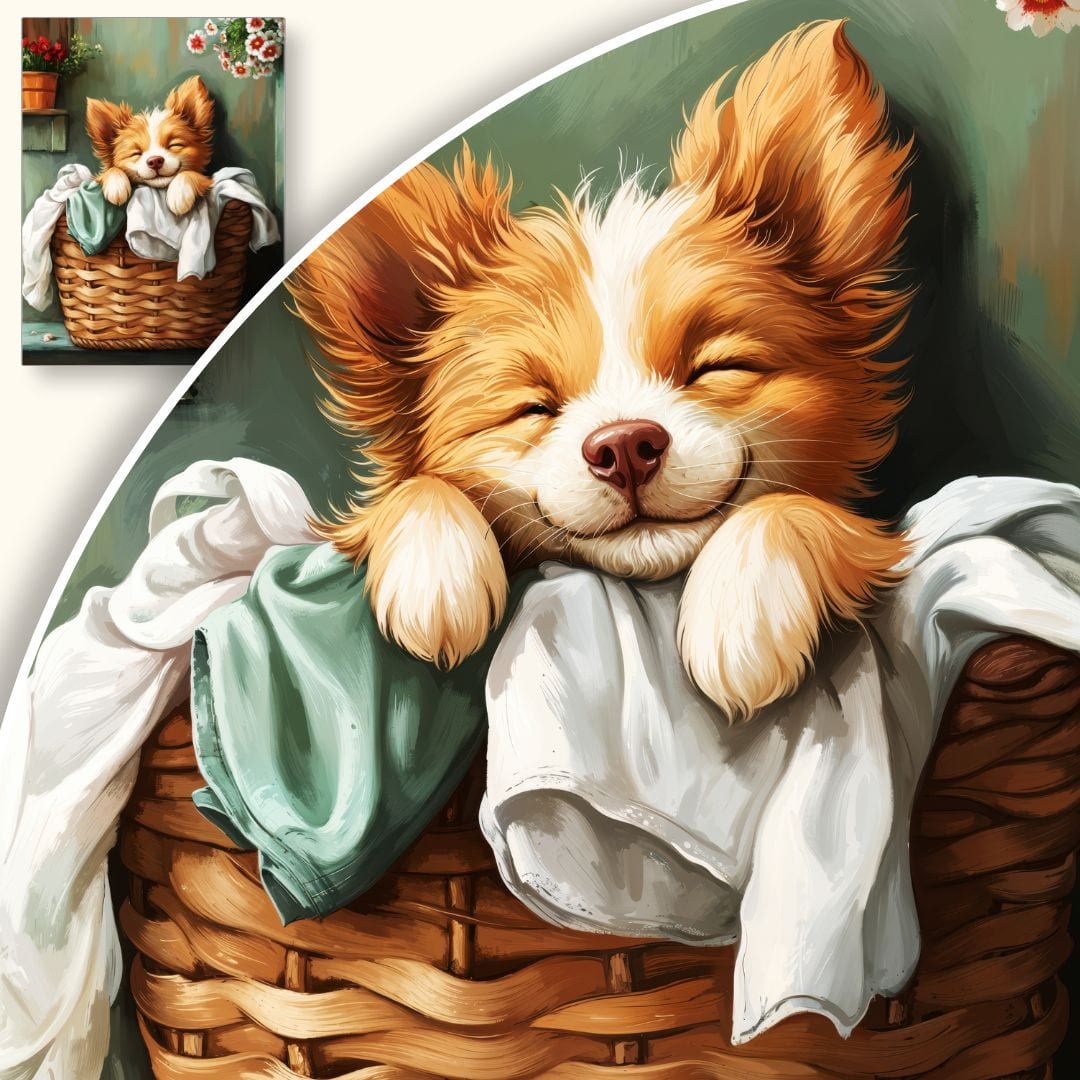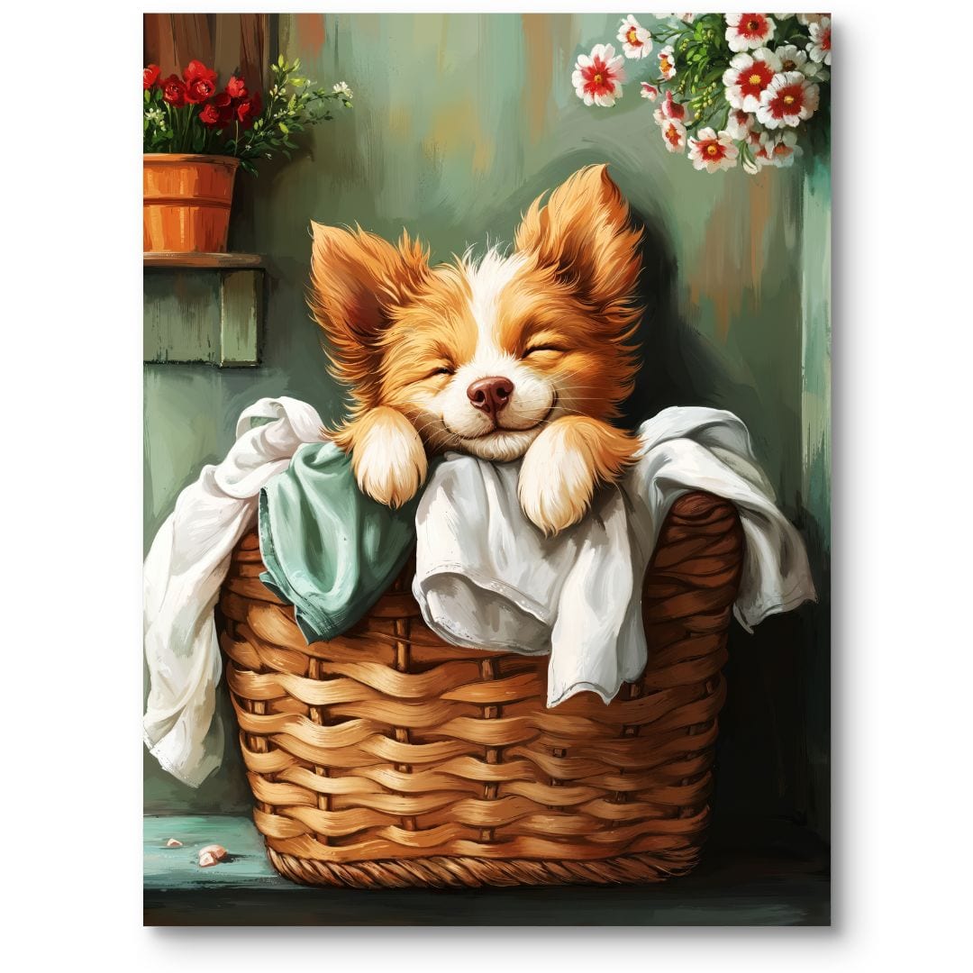 Ten plakat promieniuje pozytywnym, pogodnym nastrojem, wprowadzając do wnętrza przytulność i wywołując uśmiech. Scena psa odpoczywającego w koszu symbolizuje komfort, beztroskę i domowe bezpieczeństwo, a otaczające go kwiaty są wyrazem naturalnego piękna oraz harmonii. To wzór celebrujący uroki prostego i spełnionego życia.