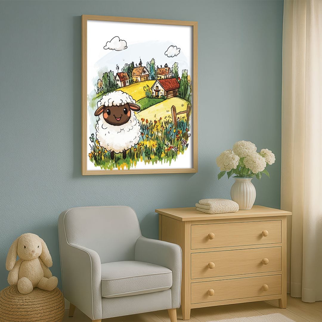 Kompozycja plakatu została starannie przemyślana. Wyeksponowana na pierwszym planie owca przyciąga uwagę i nadaje całości wyrazisty punkt centralny. W głębi zatopione w zieleni domki współtworzą pejzaż, w którym barwne kwiaty i subtelnie pofalowane wzgórza budują atmosferę spokoju oraz dużą głębię wizualną. Harmonia ciepłych, naturalnych kolorów – żółci i zieleni – sprawia, że plakat wnosi do wnętrza przyjemny, pogodny akcent.