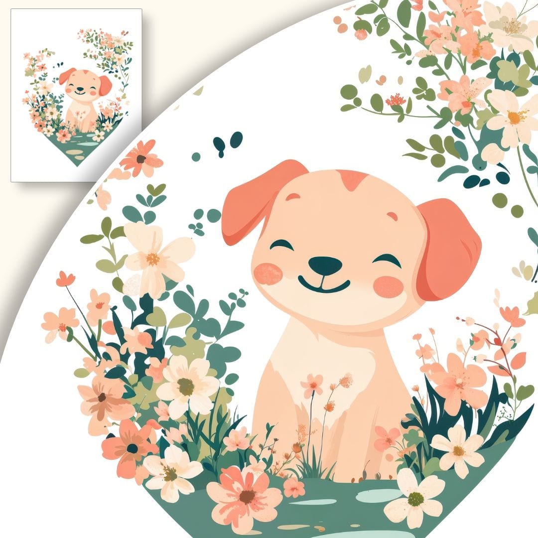 Prezentowany plakat to urocza ilustracja przedstawiająca radosnego pieska, wygodnie siedzącego pośród kwiatów ułożonych w kształt serca. Kolorowa, pełna życia flora sprawia, że kompozycja emanuje przyjaźnią, optymizmem i beztroską. Motyw psa i kwiatów stanowi zaproszenie do świata dziecięcej radości i niewinności.