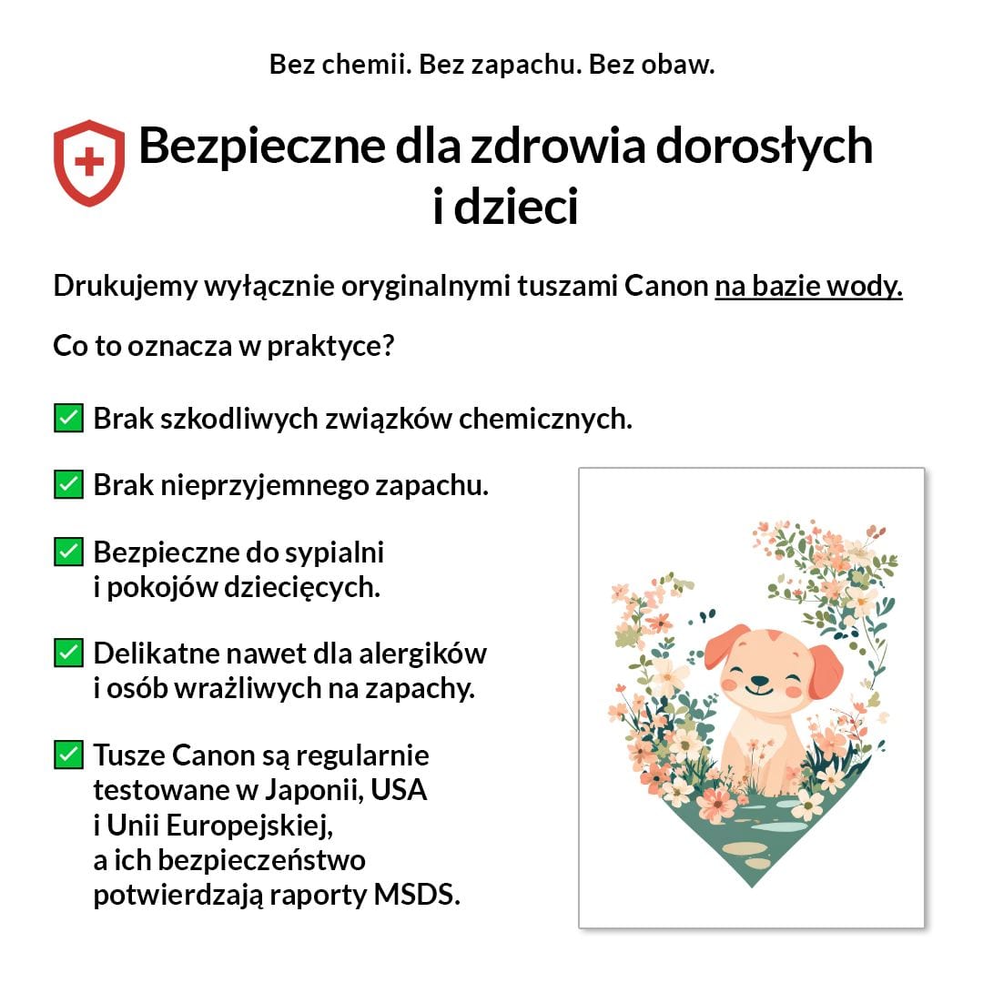 Tak, absolutnie! Drukujemy wyłącznie certyfikowanymi, bezwonnymi tuszami pigmentowymi Canon Lucia Pro na bazie wody. Są one w pełni bezpieczne dla zdrowia, nie zawierają rozpuszczalników i mogą być bez obaw stosowane w sypialniach i pokojach dziecięcych.