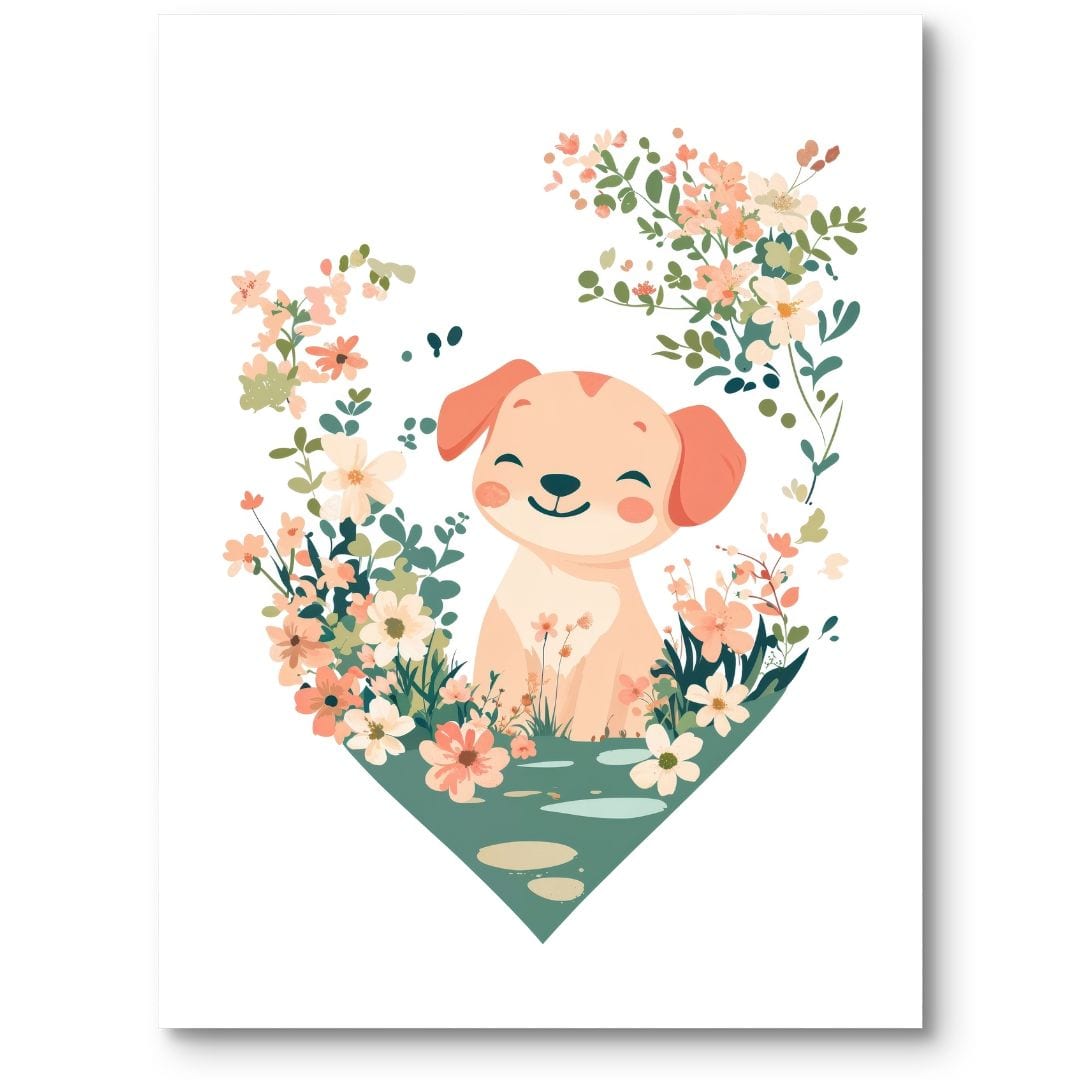 Centralnie umieszczony piesek skupia uwagę odbiorcy, a otaczające go kwiaty w formie serca tworzą naturalną ramę, dzięki której całość jest przejrzysta i estetyczna. Harmonijne rozmieszczenie elementów podkreśla pogodny charakter plakatu i sprawia, że doskonale prezentuje się na ścianie.