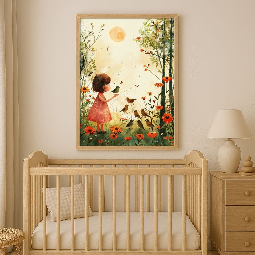 Ten wyjątkowy plakat przedstawia młodą dziewczynkę pośród ptaków, otoczoną bujną kwiecistą scenerią pod magicznym, rozgwieżdżonym niebem. Całość emanuje dziecięcą niewinnością, swobodą i radosnym spokojem natury, przenosząc widza w świat beztroskich chwil.