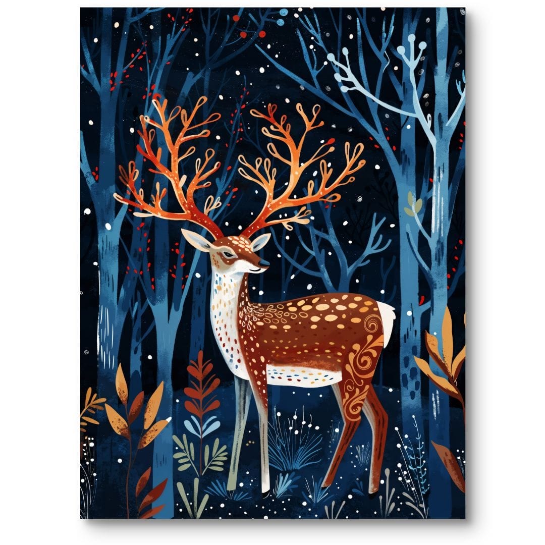 Starannie przemyślana kompozycja sprawia, że jeleń staje się niekwestionowanym centrum plakatu. Głębokie granaty przeplatają się z jasnymi akcentami poroża i intensywnością czerwonych jagód, co nadaje całości dynamiki i głębi. Gra światłocieni sprawia, że scena wydaje się utkana ze snu, jakby zatopiona w delikatnym blasku księżycowej poświaty.