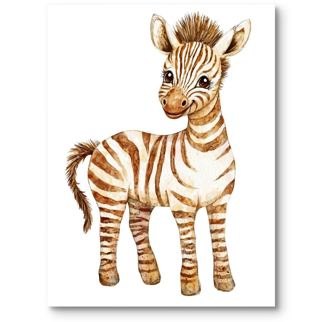 Zebry to wyjątkowe zwierzęta społeczne, które już od najmłodszych lat uczą się więzi z innymi – plakat z młodą zebrą może inspirować malucha do budowania relacji, współpracy i wspólnej zabawy.