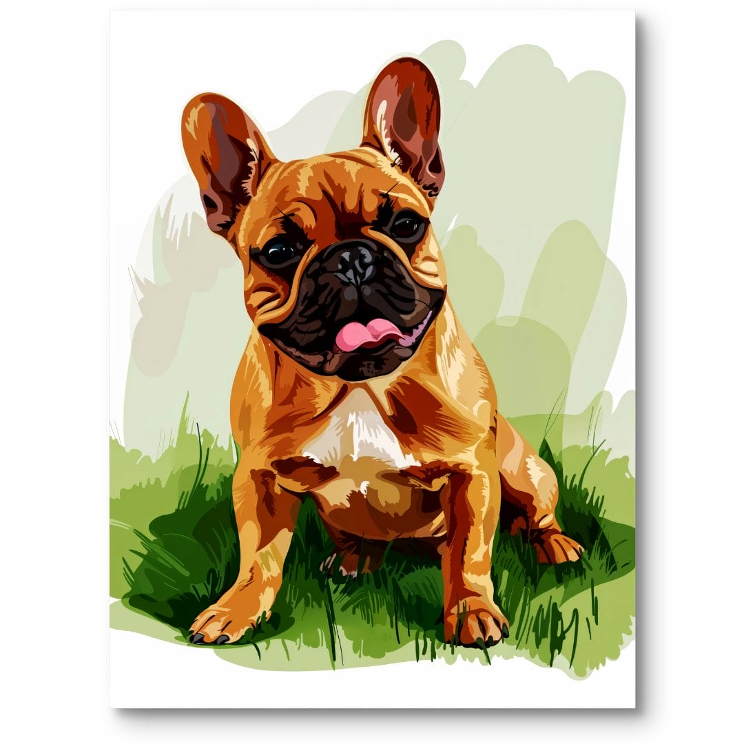 Ten plakat to zachwycający portret buldożka francuskiego, który wygodnie rozsiadł się na soczyście zielonej trawie. Realistyczna interpretacja znakomicie oddaje nie tylko wygląd, ale i charakter tego niezwykle uroczego psa. Całość utrzymana jest w przyjemnych, naturalnych tonacjach – od ciepłych brązów, przez rozświetlającą biel, aż po głęboką zieleń tła.