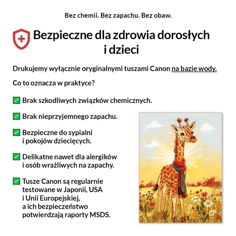Tak, absolutnie! Drukujemy wyłącznie certyfikowanymi, bezwonnymi tuszami pigmentowymi Canon Lucia Pro na bazie wody. Są one w pełni bezpieczne dla zdrowia, nie zawierają rozpuszczalników i mogą być bez obaw stosowane w sypialniach i pokojach dziecięcych.