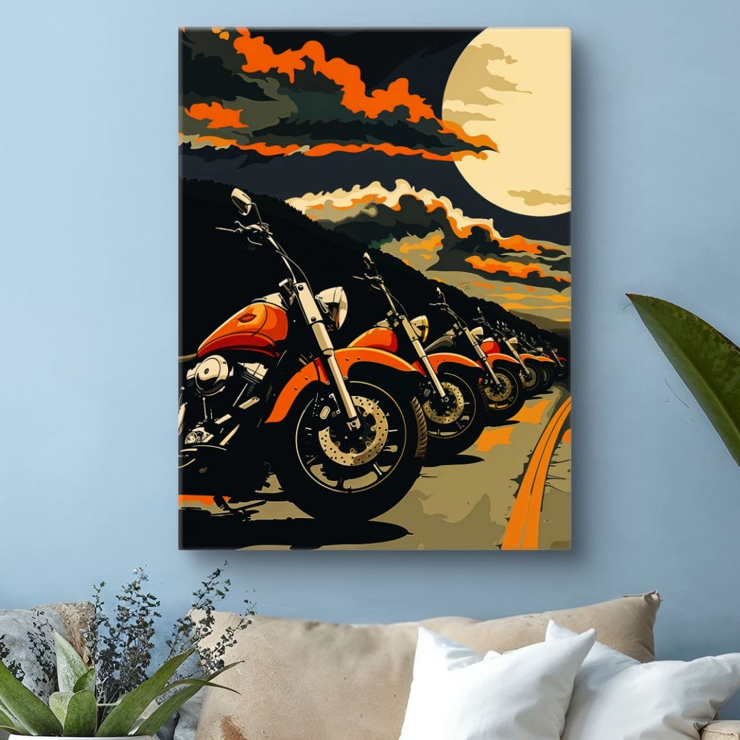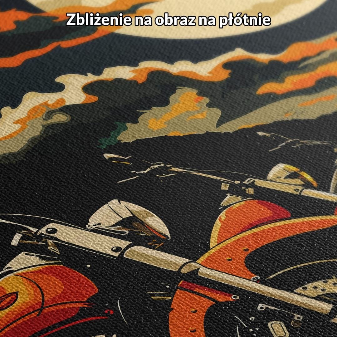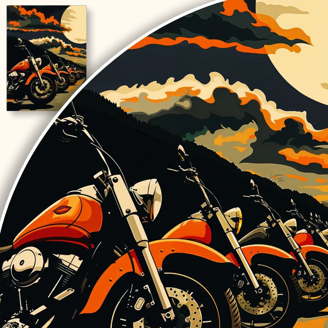 Kompozycja plakatu jest przemyślana – motocykle ułożone w równym szeregu, a na drugim planie dramatyczne, nocne niebo. Ciepłe odcienie pomarańczu, głęboka czerń i subtelny beż współgrają ze sobą, budując unikalny klimat. Jasny blask księżyca kontrastuje z ciemnością, dodając scenie głębi i znaczenia.
