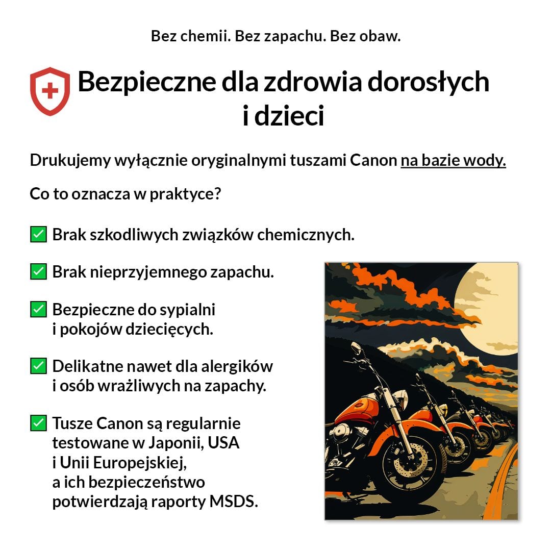 Tak, absolutnie! Drukujemy wyłącznie certyfikowanymi, bezwonnymi tuszami pigmentowymi Canon Lucia Pro na bazie wody. Są one w pełni bezpieczne dla zdrowia, nie zawierają rozpuszczalników i mogą być bez obaw stosowane w sypialniach i pokojach dziecięcych.