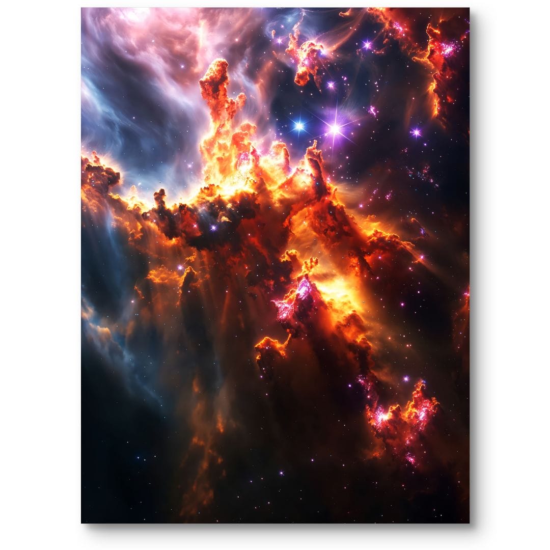 Dzieło wyróżnia się dynamiczną kompozycją, w której pomarańczowe smugi gazu subtelnie kontrastują z głębokimi fioletami i czernią bezkresnej przestrzeni. Efektowne, niemal teatralne światło, łagodnie wydobywające się z nebuli, tworzy widowiskowy i hipnotyzujący efekt wizualny.