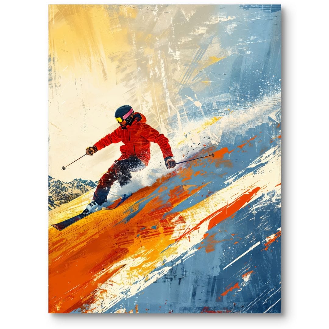 Centralnie ulokowana sylwetka narciarza stanowi dynamiczny punkt kompozycji, wciągając wzrok widza w zawrotny ruch. Ostre kontrasty pomiędzy oranżem, błękitem a śnieżną bielą dodają intensywności, podkreślając szybkość oraz świeżość całej sceny.