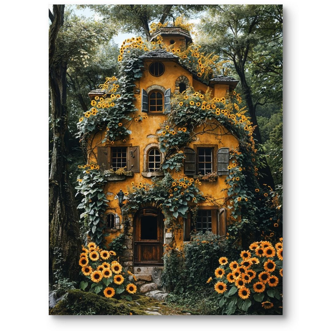 Ten plakat przedstawia urokliwy, rustykalny dom otulony bujną winoroślą, wśród rozświetlonych słońcem kwitnących słoneczników. Scena ta ukazuje idylliczne życie w symbiozie z naturą – dom, który stapia się z otoczeniem, zapraszając ciepło oraz harmonię do dowolnego wnętrza.