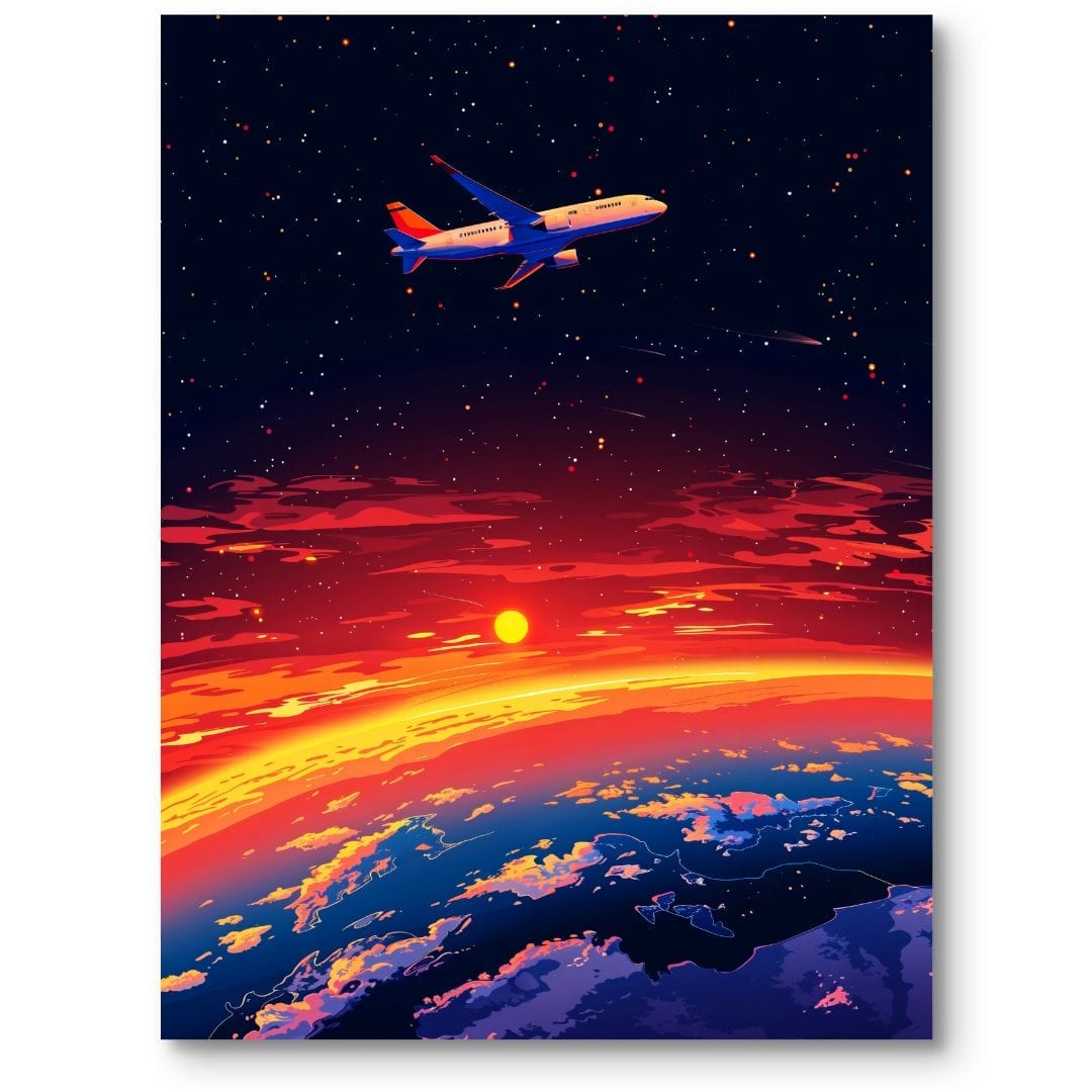 Kompozycja plakatu jest pełna energii, z centralnie umieszczonym samolotem, który momentalnie przykuwa uwagę. Rozświetlone, gwiaździste niebo stanowi kontrast dla ciepłych odcieni zachodu słońca. Paleta barw oparta na kontrastach, zarówno świetlnych, jak i kolorystycznych, podkreśla głębię i ekspresję całości.