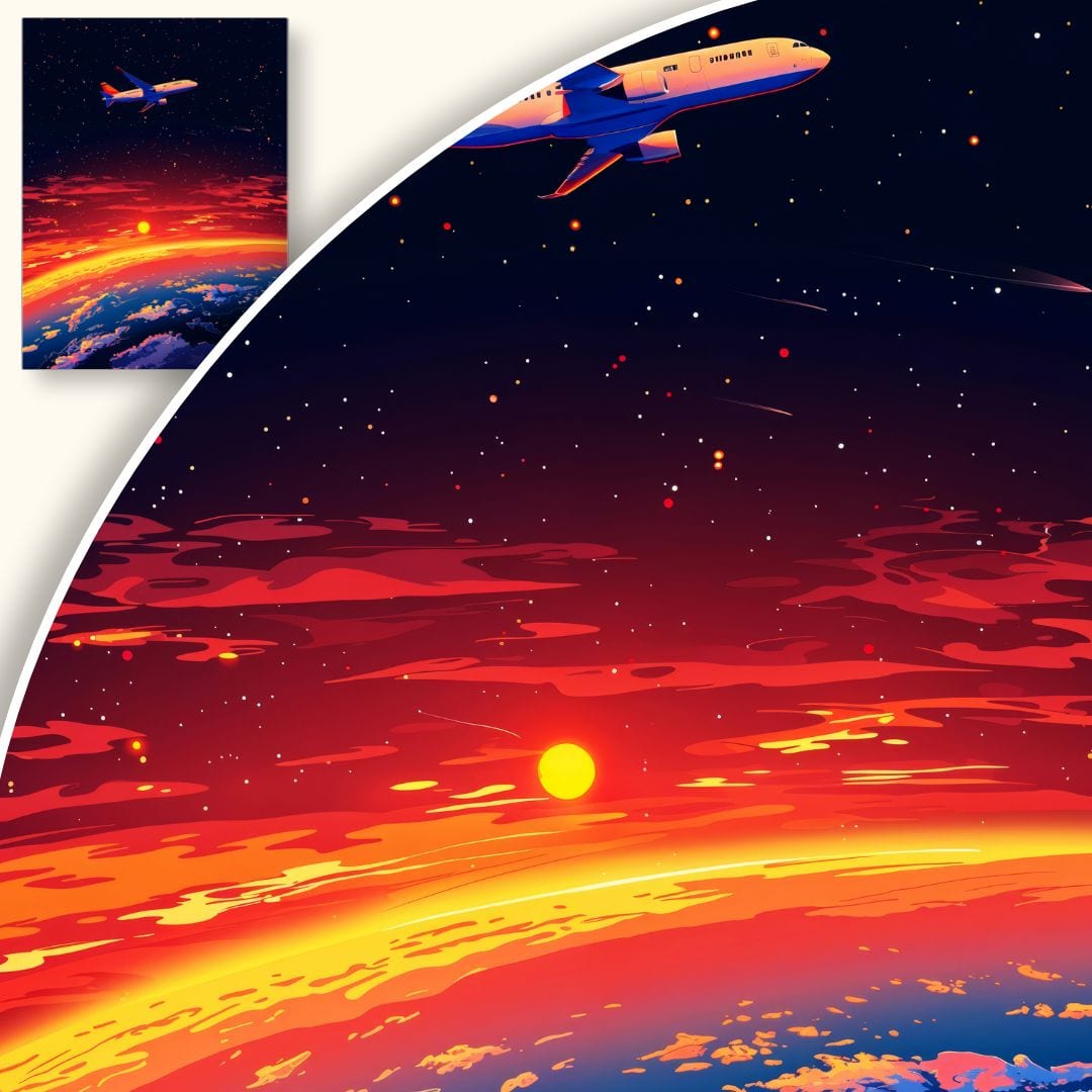 Plakaty przedstawiające widoki z kosmosu inspirowane są tradycją sztuki science-fiction. Podobne motywy eksplorowała m.in. twórczość Chesleya Bonestella, uchodzącego za ojca wizualizacji kosmicznych podróży. Obecność samolotu na tle kosmicznych pejzaży symbolicznie łączy marzenia o niezgłębionych przestworzach z rzeczywistością współczesnych podróżników i odkrywców.