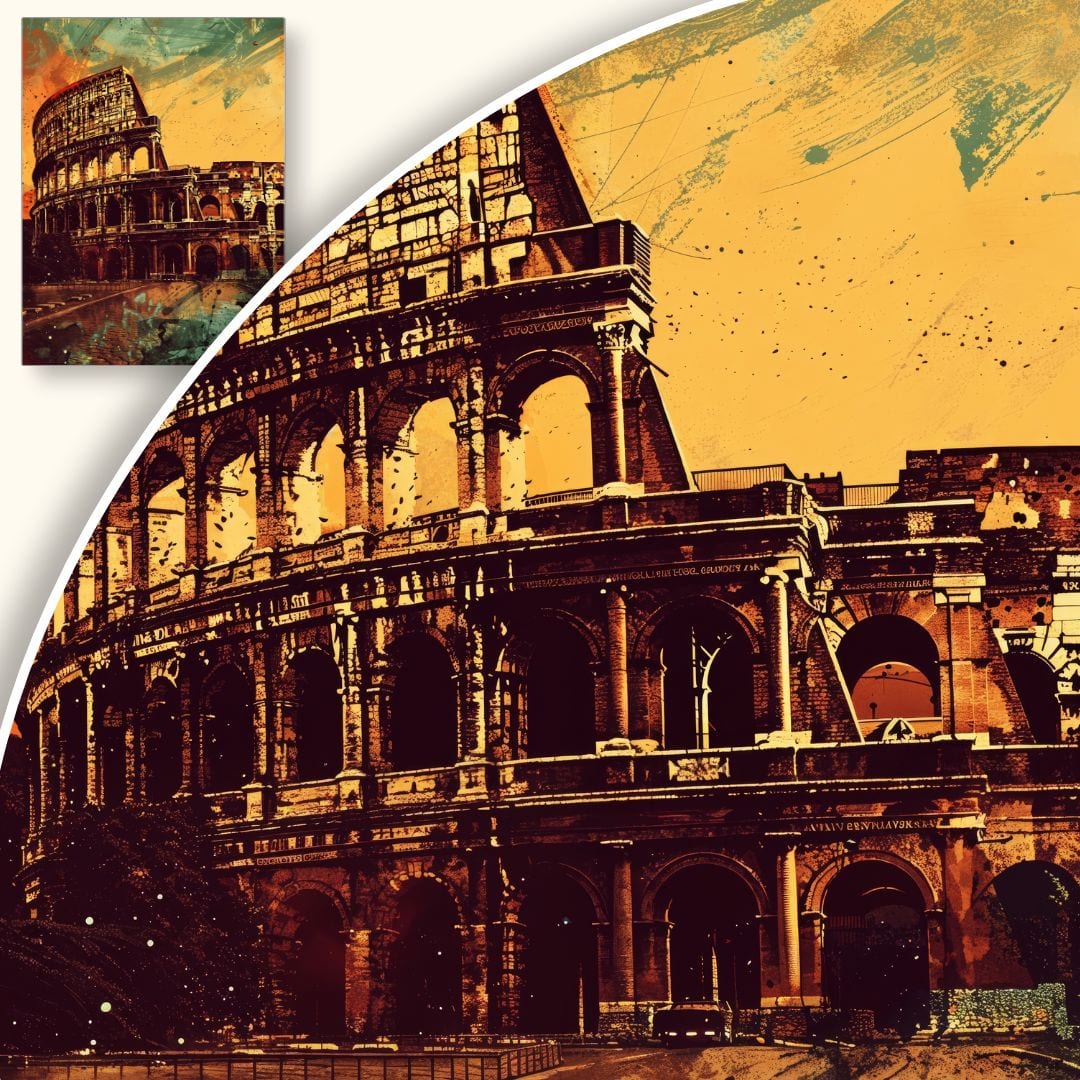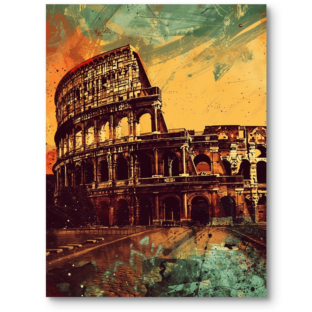 Centralnie umieszczone Koloseum wybija się na tle barwnych, niemal malarskich plam w odcieniach pomarańczy, zieleni i brązu. Całość kompozycji jest dynamiczna, a różnorodność faktur przyciąga uwagę i dodaje obrazowi głębi. Światło delikatnie modeluje architektoniczne detale, wzmacniając wrażenie monumentalności i autentyczności tego ikonicznego zabytku.