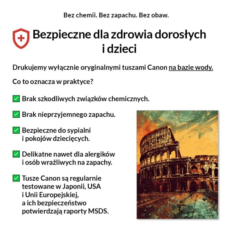 Tak, absolutnie! Drukujemy wyłącznie certyfikowanymi, bezwonnymi tuszami pigmentowymi Canon Lucia Pro na bazie wody. Są one w pełni bezpieczne dla zdrowia, nie zawierają rozpuszczalników i mogą być bez obaw stosowane w sypialniach i pokojach dziecięcych.