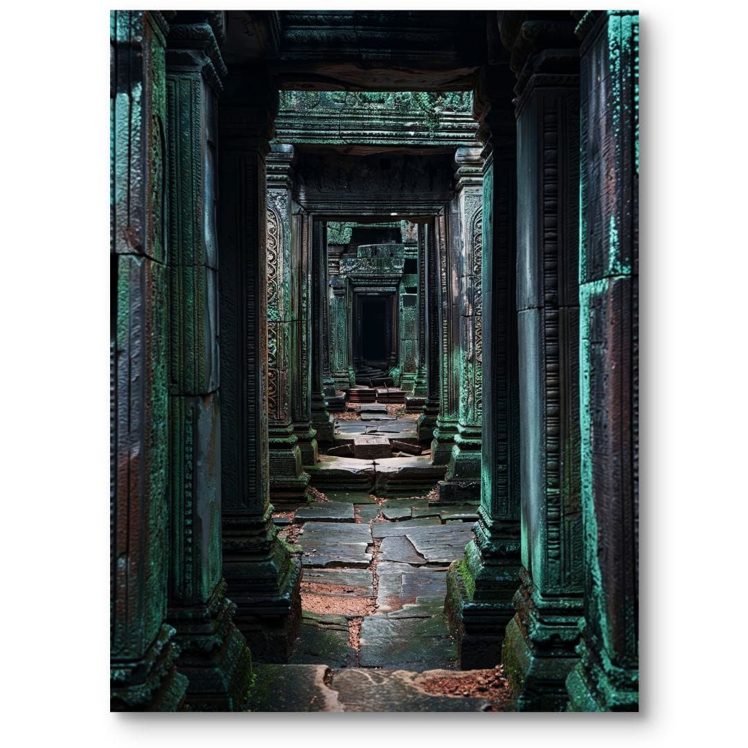 Prezentowany plakat ukazuje mistyczny korytarz starożytnej świątyni, którego atmosferę budują bogato zdobione kolumny oraz zagadkowy klimat wąskiego przejścia prowadzącego w nieznane. Każdy szczegół oddaje niezwykłą historię dawnych cywilizacji, zapraszając do odkrywania ich tajemnic.