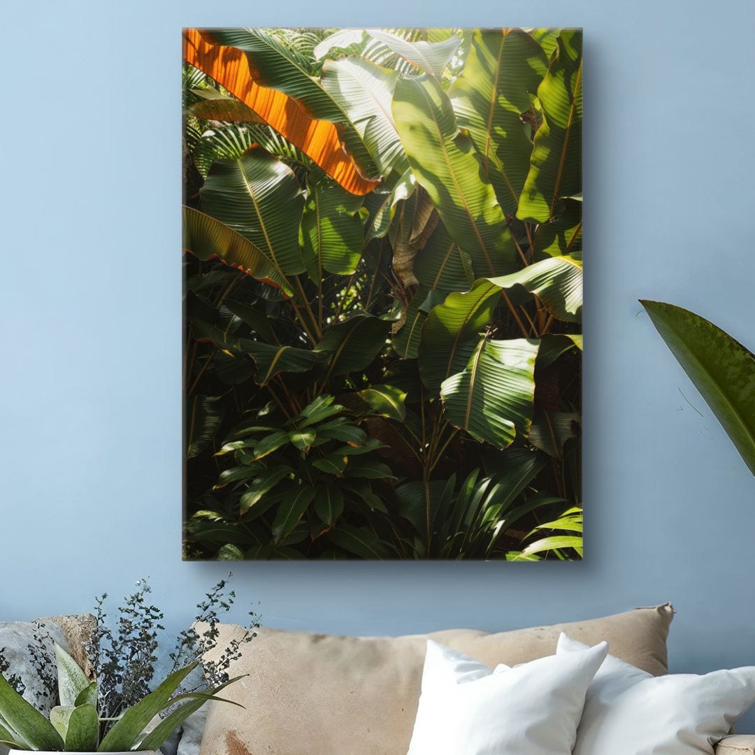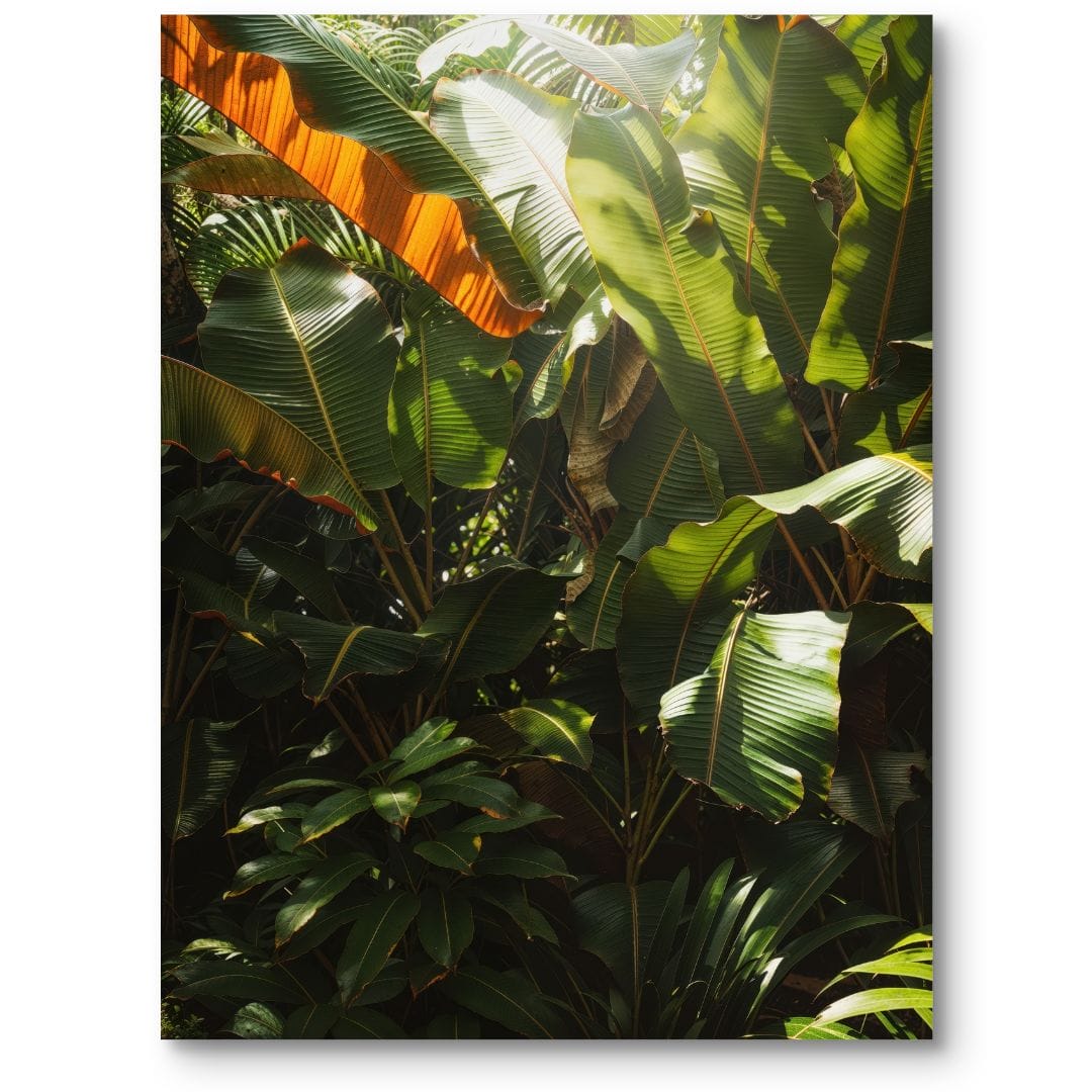 Ten plakat ukazuje bujne, soczyste liście egzotycznych roślin, kąpiące się w subtelnych promieniach słońca. Tematyka przenosi nas w niezwykły świat przyrody, eksponując urok tropikalnego ogrodu lub tajemniczej dżungli. Intensywne, energetyczne kolory nadają kompozycji wyjątkową świeżość i przyciągają uwagę naturalnym wdziękiem.