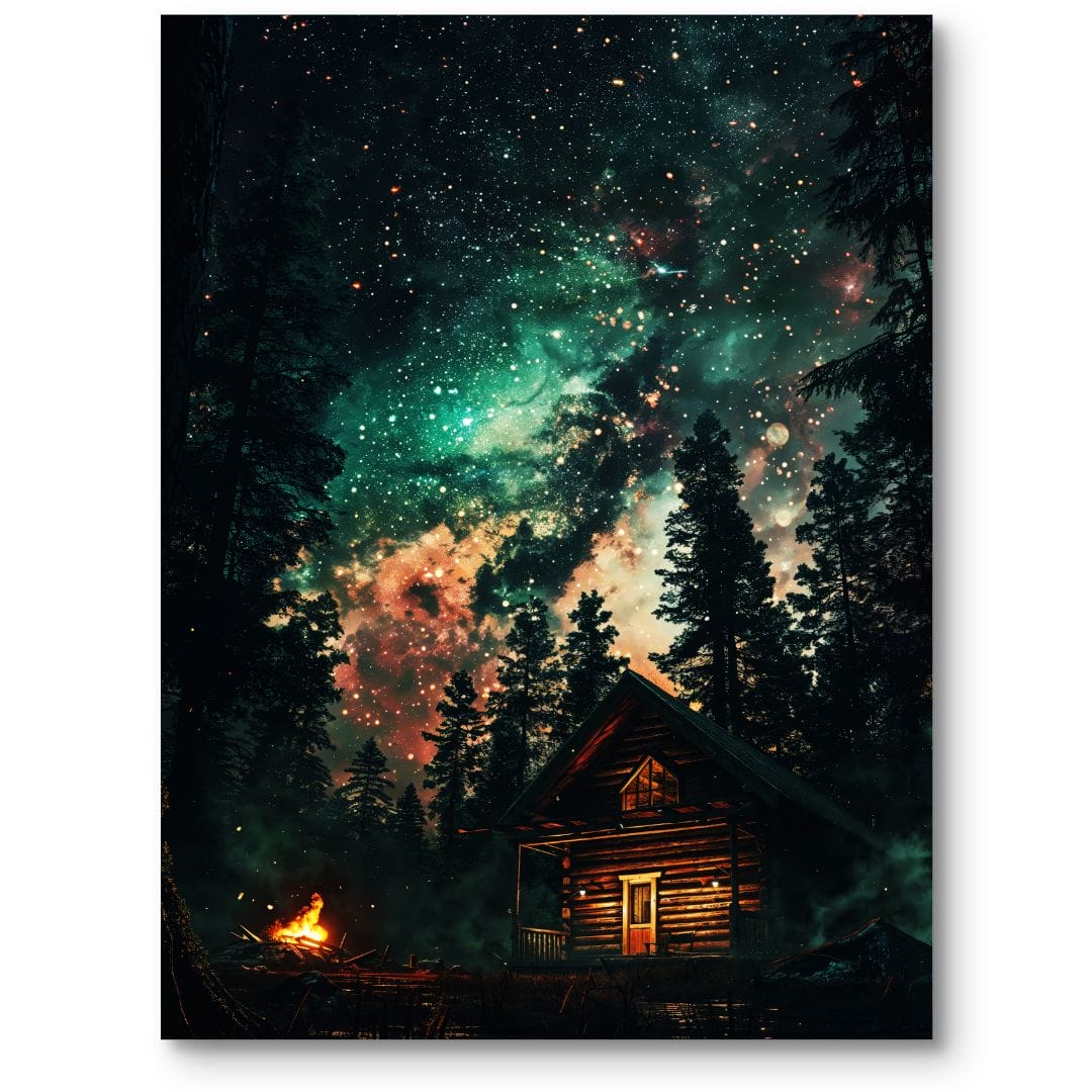 - Wyjątkowy plakat z motywem leśnego domku pod gwiazdami