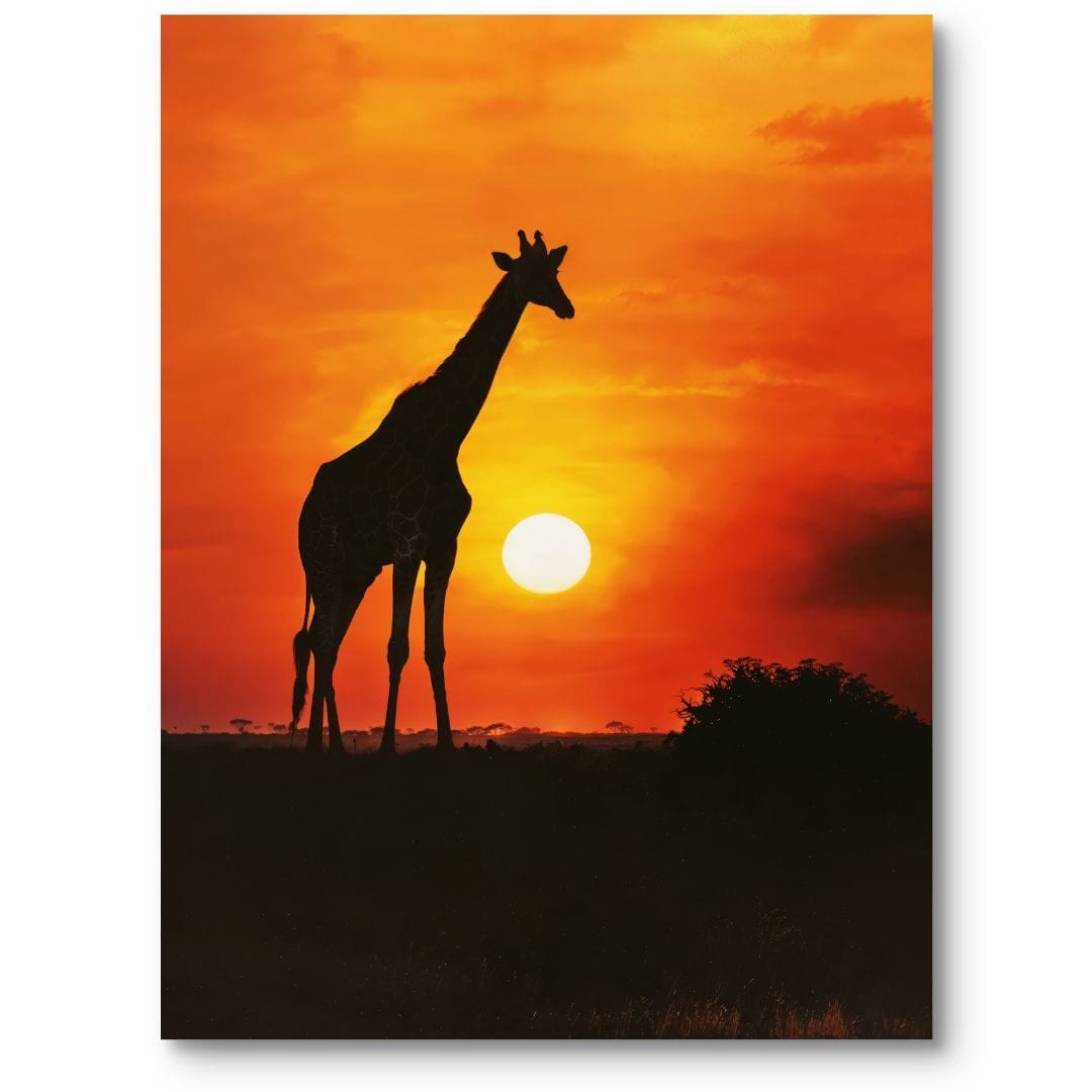 - Realistyczny plakat z sylwetką żyrafy na tle pomarańczowego zachodu słońca