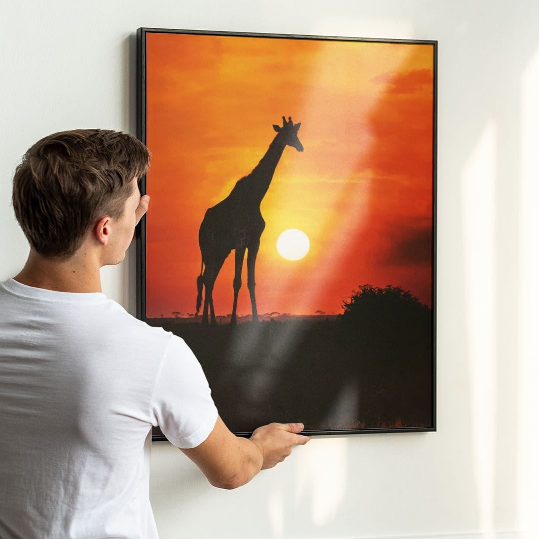 Plakat z żyrafą emanuje spokojem, gracją i poczuciem harmonii z naturą. Żyrafa – symbol łagodności i wytrwałości – wprowadza atmosferę wyciszenia, przypominając o magii afrykańskich wieczorów pełnych słońca.