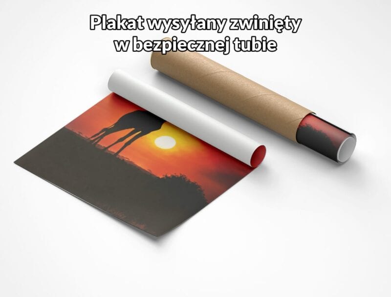 Dzięki zastosowaniu realistycznej fotografii plakat zachwyca autentycznością detali i głębią barw, oddając prawdziwe oblicze dzikiej natury. Ujęcie skupia się na naturalnych proporcjach i unikalnej sylwetce żyrafy, dzięki czemu scena niemal ożywa na Twojej ścianie.