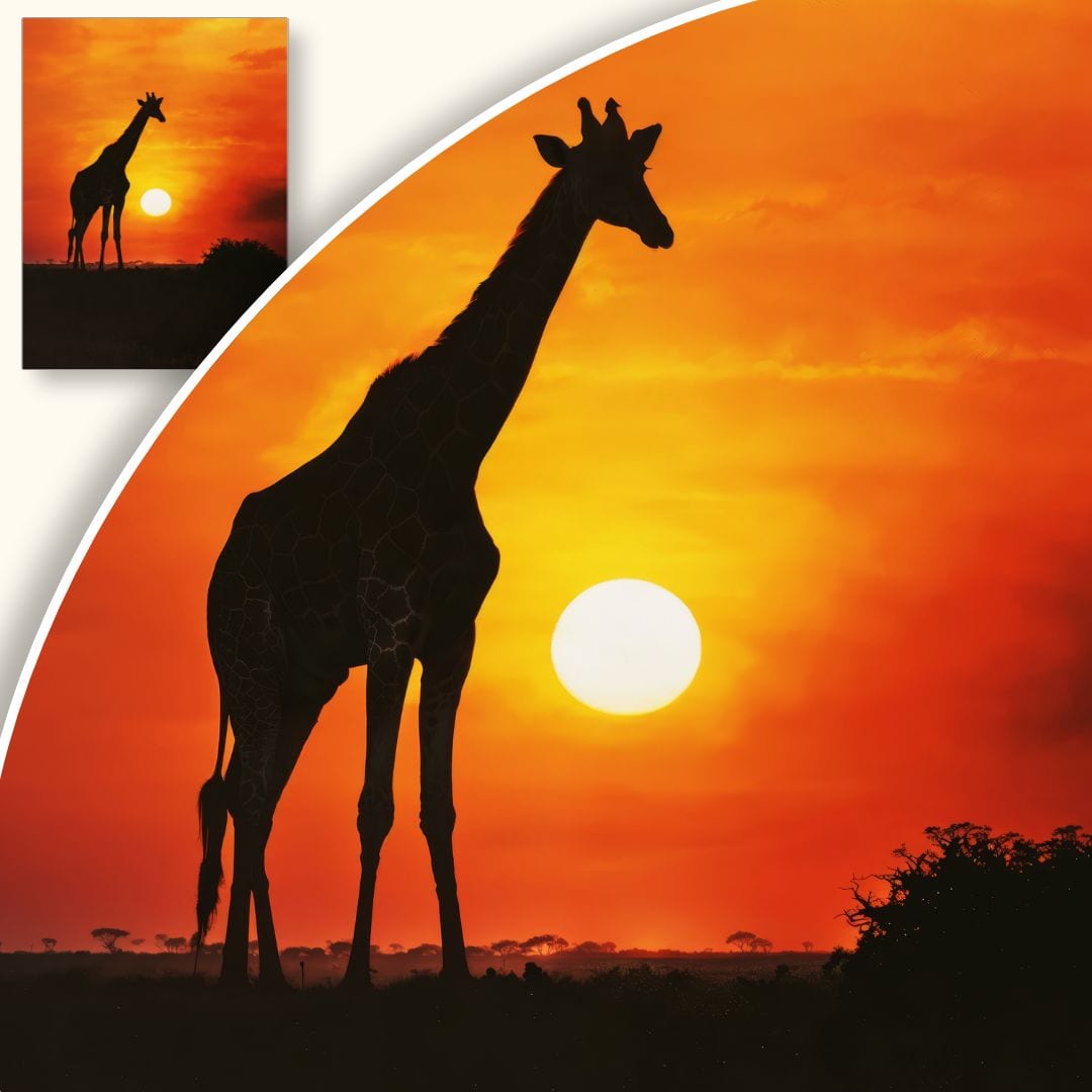 Centralne umiejscowienie żyrafy na tle okazałego, złocistego słońca nadaje kompozycji równowagi i wyjątkowej dynamiki. Ciepłe, pomarańczowe i żółte tonacje wprowadzają przytulny nastrój i optymizm, a wyraźny kontrast między postacią zwierzęcia a pastelowym niebem dodatkowo wzmacnia głębię obrazu.