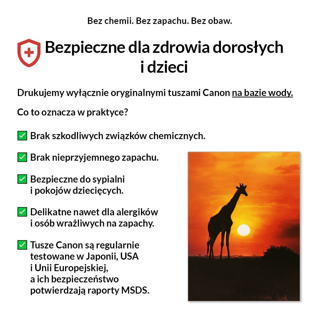Tak, absolutnie! Drukujemy wyłącznie certyfikowanymi, bezwonnymi tuszami pigmentowymi Canon Lucia Pro na bazie wody. Są one w pełni bezpieczne dla zdrowia, nie zawierają rozpuszczalników i mogą być bez obaw stosowane w sypialniach i pokojach dziecięcych.