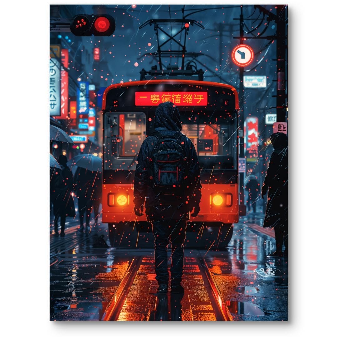 Plakat ukazuje postać w ciemnym płaszczu, stojącą naprzeciw rozświetlonego czerwonym światłem tramwaju na tle nocnej, miejskiej scenerii. Mokre od deszczu ulice odbijają neonowe światła, budując tajemniczy, niemal filmowy klimat przyszłości.