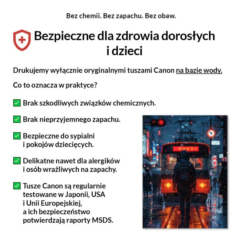 My drukujemy wyłącznie na pigmentowych tuszach Canon LUCIA PRO, bezpiecznych, bezzapachowych i certyfikowanych.