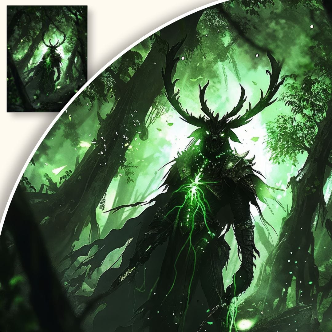 Plakat ukazuje niezwykłą, fantastyczną postać w głębi ciemnego lasu, rozświetloną przez tajemnicze, zielone światła. Bohater kompozycji przypomina legendarnego strażnika natury z majestatycznymi rogami, co dodaje całości aurę tajemniczości oraz odrealnienia.
