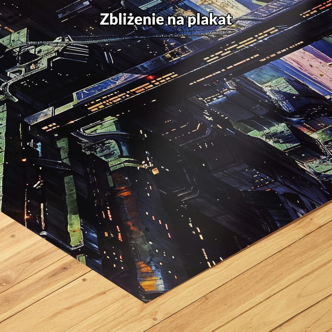 Plakat przedstawia klimatyczne, futurystyczne miasto nocą, pełne majestatycznych wieżowców oraz intrygujących, strukturalnych mostów. Oświetlone intensywnymi neonami, urbanistyczne pejzaże przenoszą widza w świat cyberpunkowej rzeczywistości, gdzie zaawansowana technologia oraz imponująca architektura zdecydowanie dominują nad przyrodą.