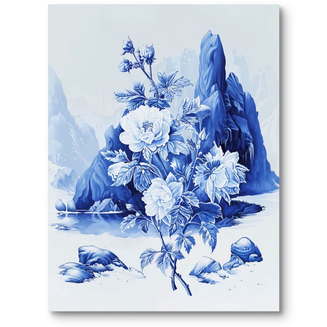 Plakat na ścianę przedstawia kojący krajobraz z majestatycznymi górami w tle oraz subtelnymi, delikatnie rozkwitającymi peoniami na pierwszym planie. Połączenie chłodnych odcieni niebieskiego i bieli nadaje całości niezwykłej elegancji i kreuje harmonijną atmosferę, w której natura spotyka się ze sztuką. Dbałość o tradycyjne detale inspirowane chińskim malarstwem umożliwia głębsze zanurzenie się w magiczny świat przedstawiony na plakacie.