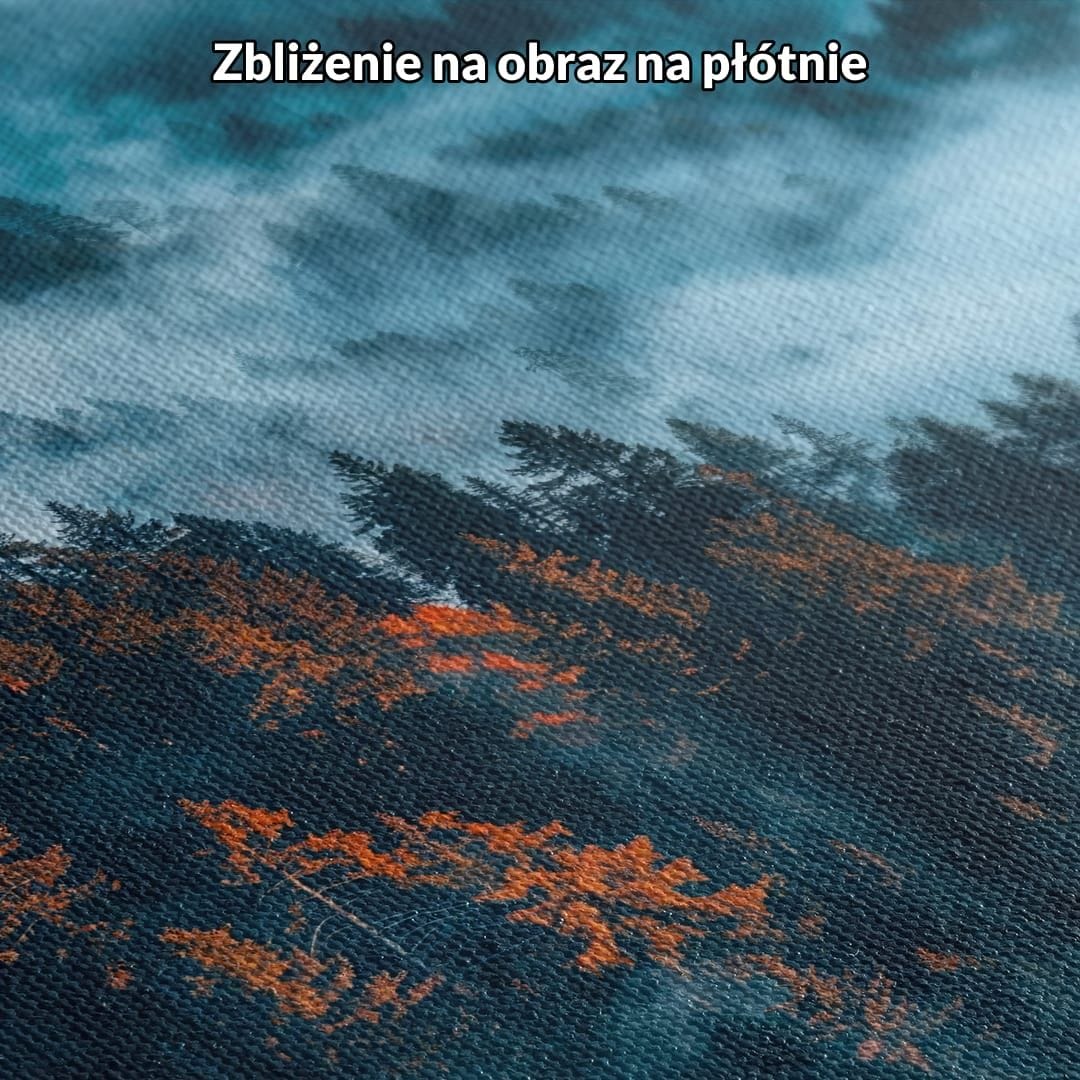 Wyraziste pionowe linie drzew kierują spojrzenie ku szczytom zanurzonym w niebieskiej mgle, podczas gdy złote promienie słońca nadają całości głębi i energii. Zestawienie chłodnych błękitów z ciepłymi pomarańczami buduje subtelną dramaturgię, a miękkie światło podkreśla fotograficzny urok tej kompozycji.