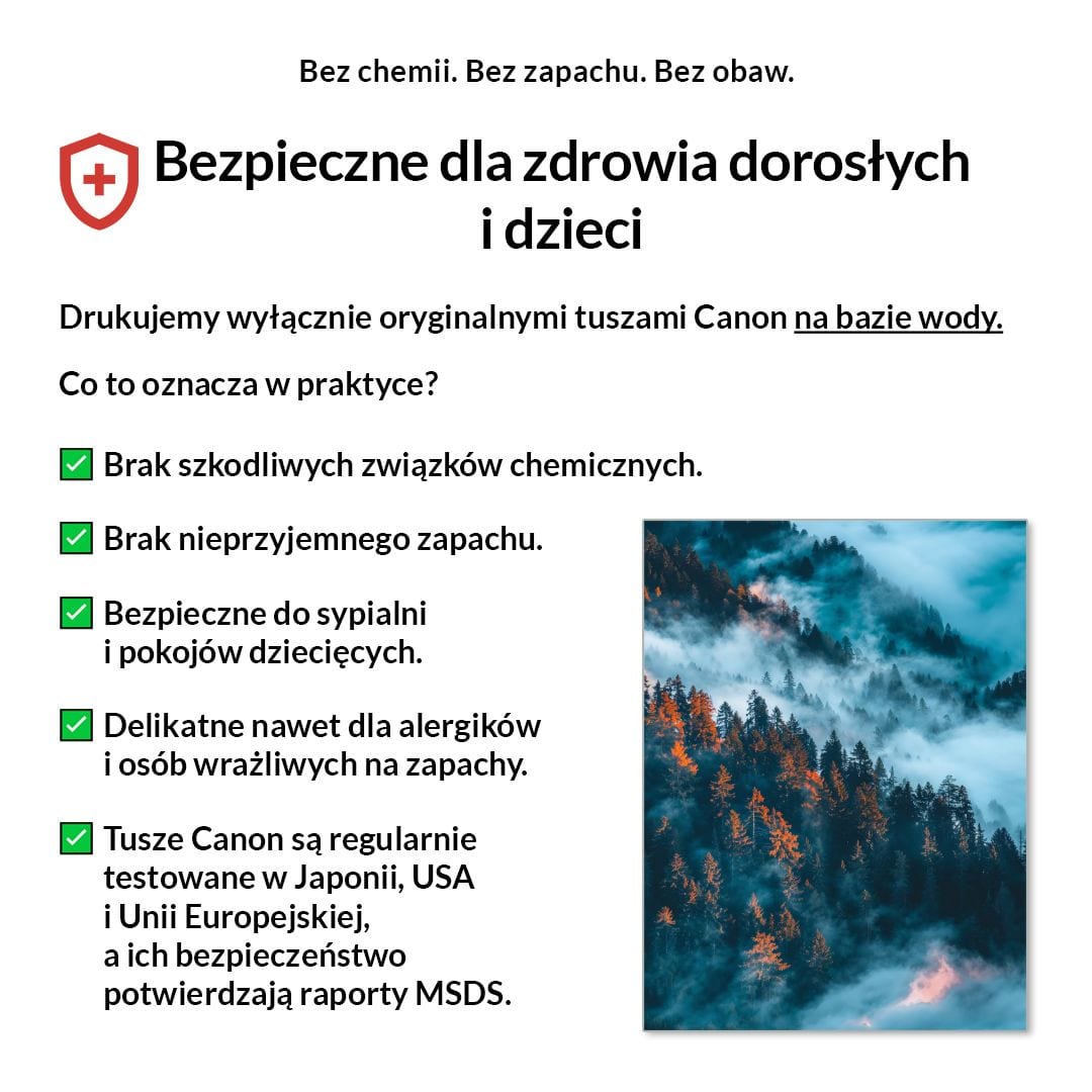 Tak, absolutnie! Drukujemy wyłącznie certyfikowanymi, bezwonnymi tuszami pigmentowymi Canon Lucia Pro na bazie wody. Są one w pełni bezpieczne dla zdrowia, nie zawierają rozpuszczalników i mogą być bez obaw stosowane w sypialniach i pokojach dziecięcych.