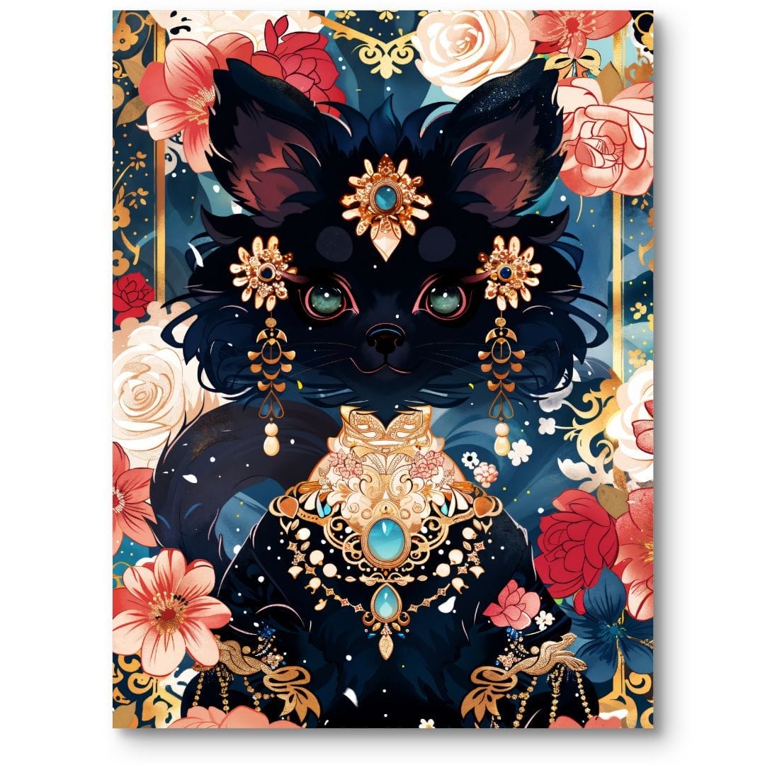 Ten niezwykły plakat ukazuje czarnego kota ozdobionego kunsztowną biżuterią, otoczonego barwną feerią kwiatów. To wyjątkowe zestawienie wdzięku zwierzęcia z ornamentyką i nutą fantazji przenosi nas do magicznego świata pełnego elegancji oraz luksusu. Kot – symbol tajemnicy i niezależności – zostaje tu subtelnie wpleciony w romantyczną, kwiatową oprawę, co czyni tę kompozycję niezwykle ciepłą i nastrojową.