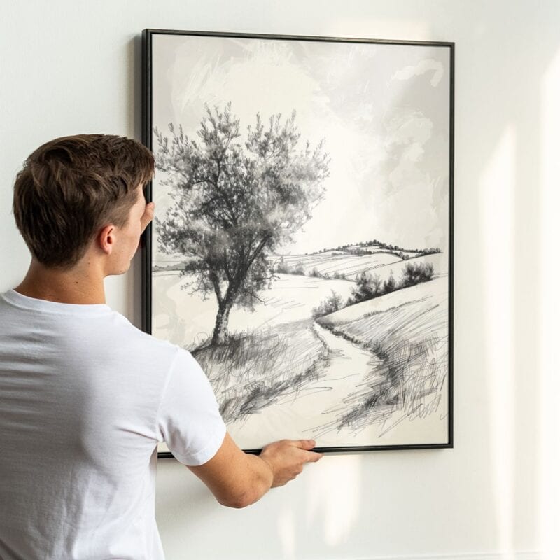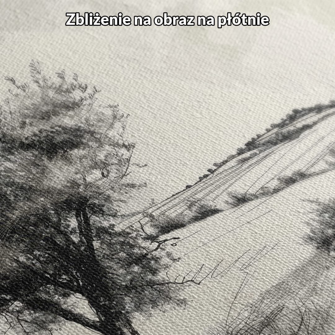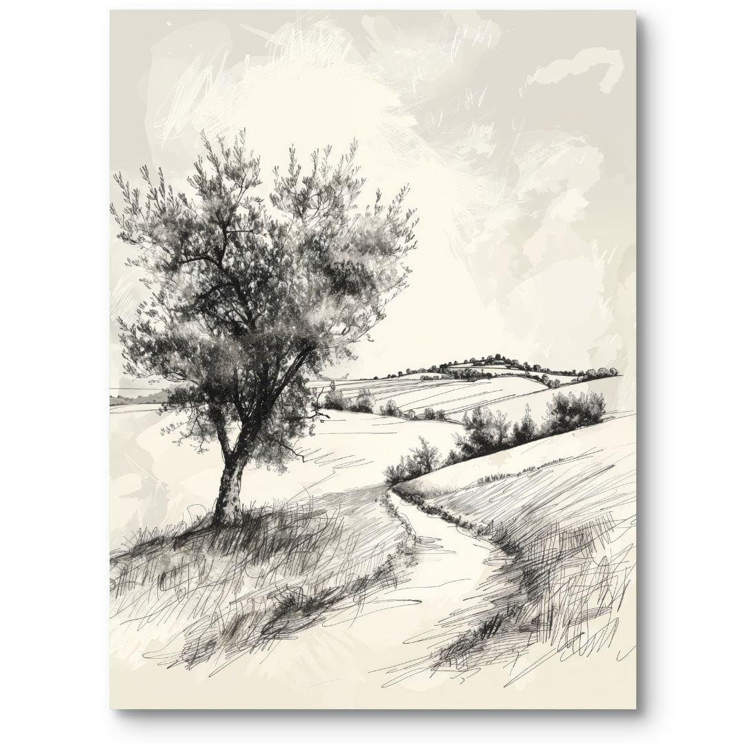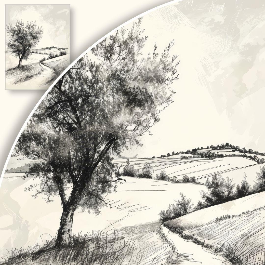 Rysunek krajobrazu wiejskiego, z samotnym drzewem jako głównym motywem, nawiązuje do dzieł klasycznych mistrzów takich jak Caspar David Friedrich, którego obrazy często przedstawiały samotne sylwetki natury i były wyrazem romantycznej tęsknoty za spokojem oraz refleksją nad przemijaniem. Czarno-biała kolorystyka koresponduje również z pracami polskich artystów pejzażowych XIX i XX wieku, łącząc tradycję z nowoczesnym minimalizmem.