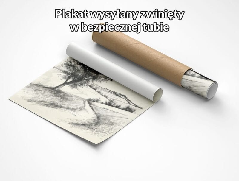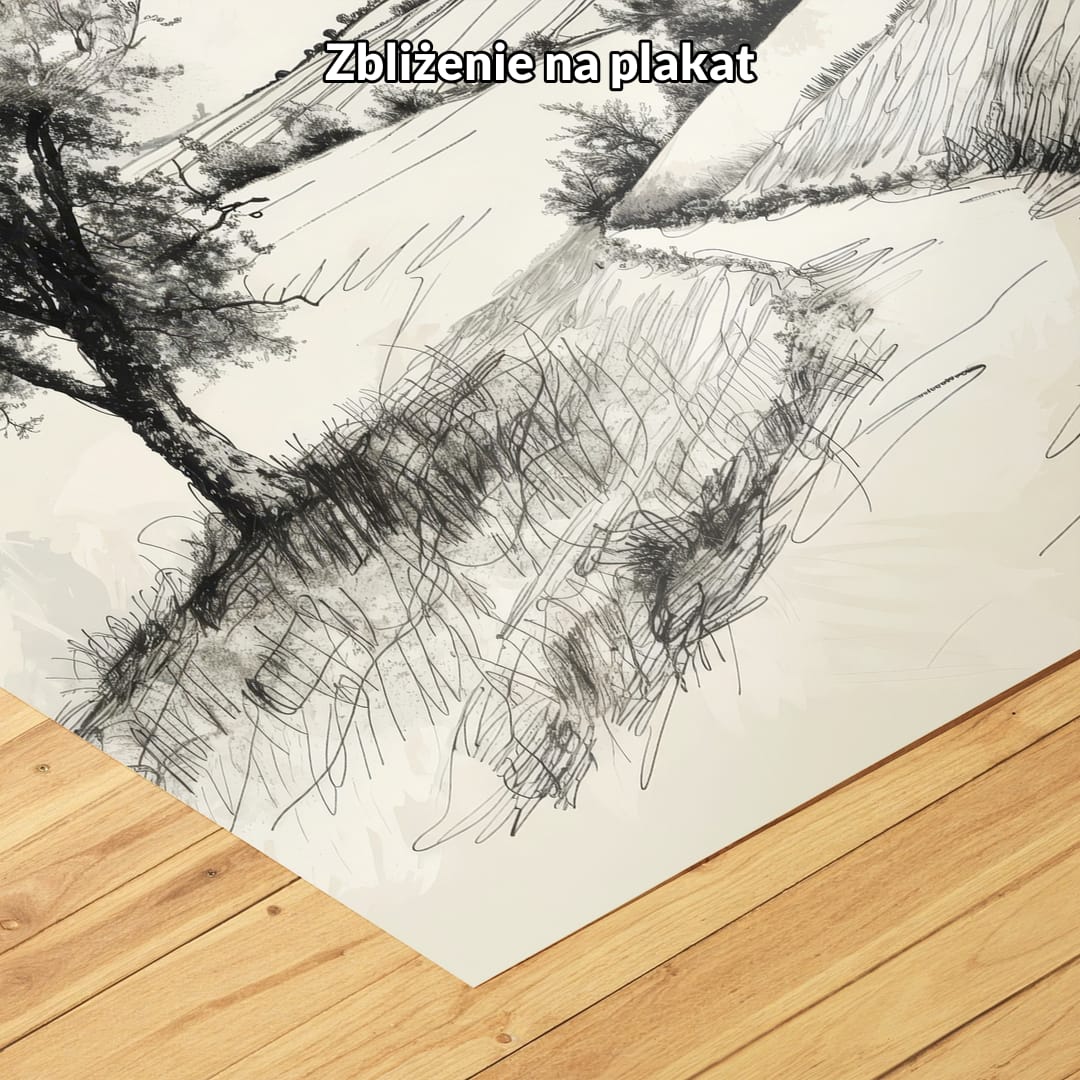 Kompozycja plakatu jest starannie zaplanowana – centralne umiejscowienie drzewa prowadzi spojrzenie widza w głąb obrazu. Światło, padające z góry, wydobywa subtelne cienie i podkreśla naturalne krzywizny krajobrazu. Monochromatyczna, czarno-biała kolorystyka nadaje plakatowi uniwersalny charakter oraz elegancki, minimalistyczny wygląd, który świetnie dopasuje się do wielu aranżacji.