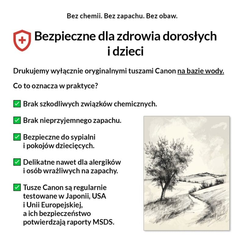 Tak, absolutnie! Drukujemy wyłącznie certyfikowanymi, bezwonnymi tuszami pigmentowymi Canon Lucia Pro na bazie wody. Są one w pełni bezpieczne dla zdrowia, nie zawierają rozpuszczalników i mogą być bez obaw stosowane w sypialniach i pokojach dziecięcych.