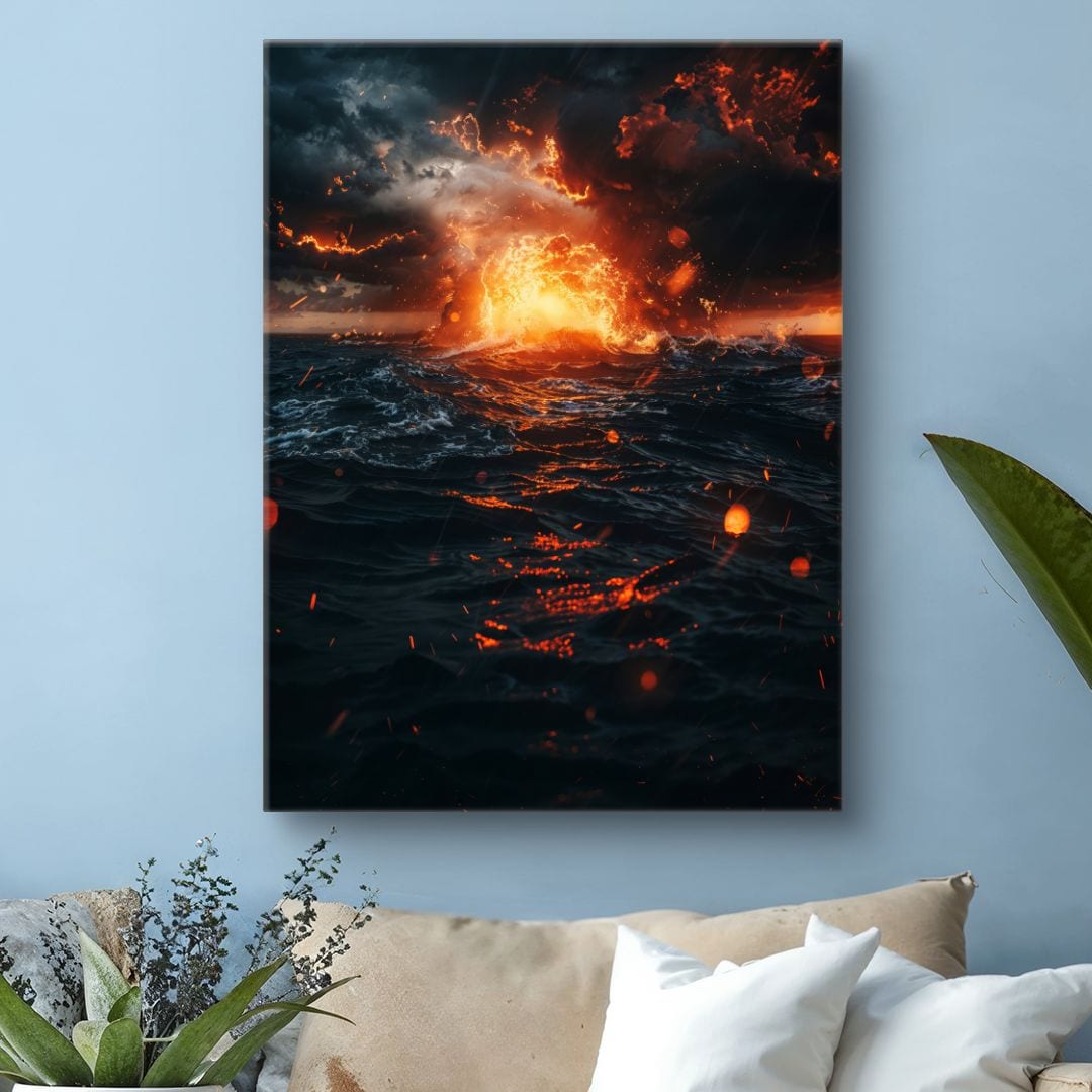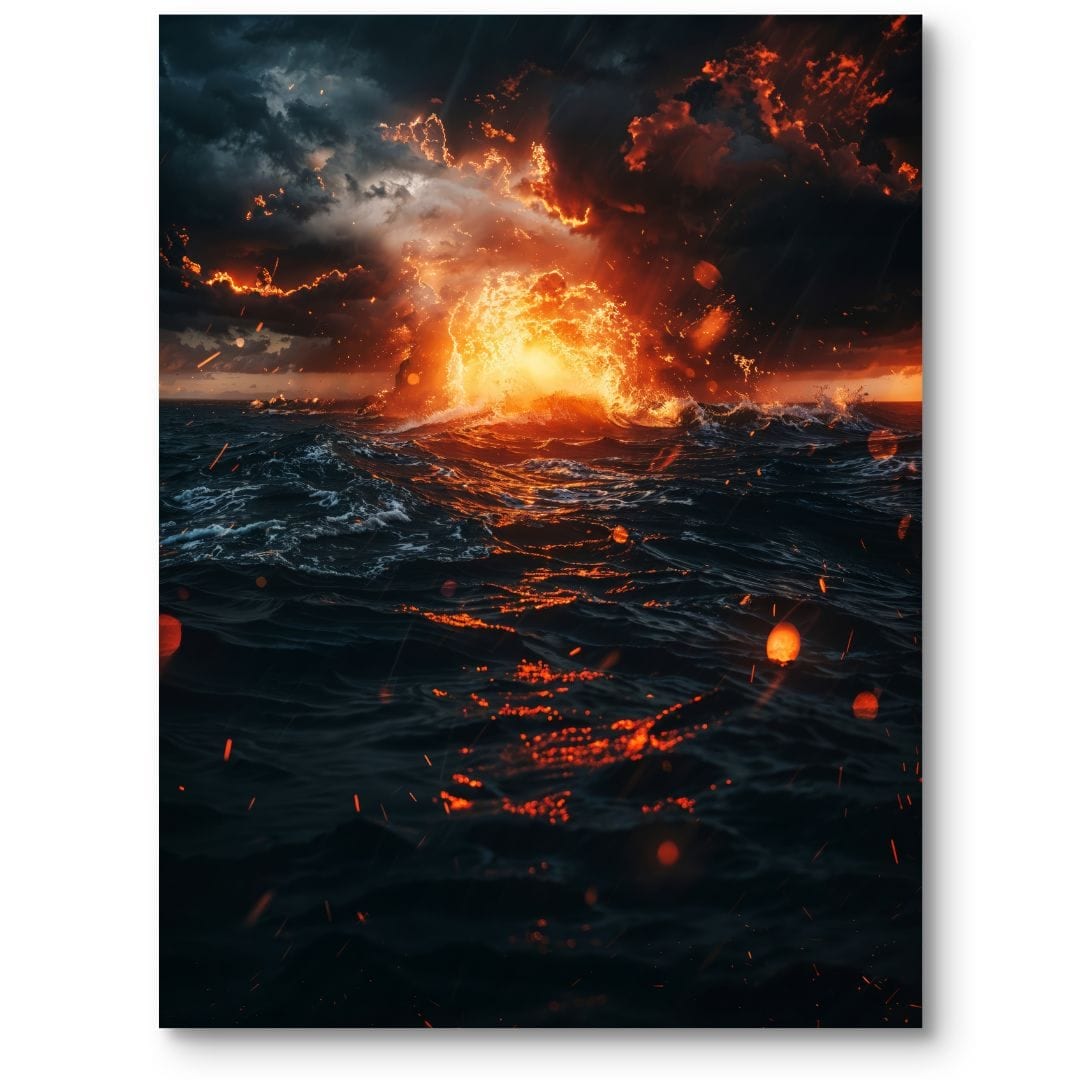 Całość emanuje atmosferą tajemnicy i niepokoju – to plakat, który przywołuje na myśl potęgę oraz nieprzewidywalność przyrody, a eksplozja na otwartym morzu może symbolizować zarówno moment chaosu, jak i nieujarzmioną siłę natury.