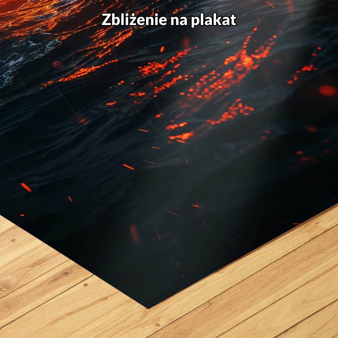 Plakat ukazuje poruszającą scenę na wzburzonym morzu: dramatyczne granatowe fale ścierają się z groźną eksplozją ognia na horyzoncie. Ten surrealistyczny motyw mistrzowsko splata potęgę natury z nieoczywistą aurą zagrożenia, kreując wizję żywiołów w ich najpełniejszej, nieokiełznanej formie.
