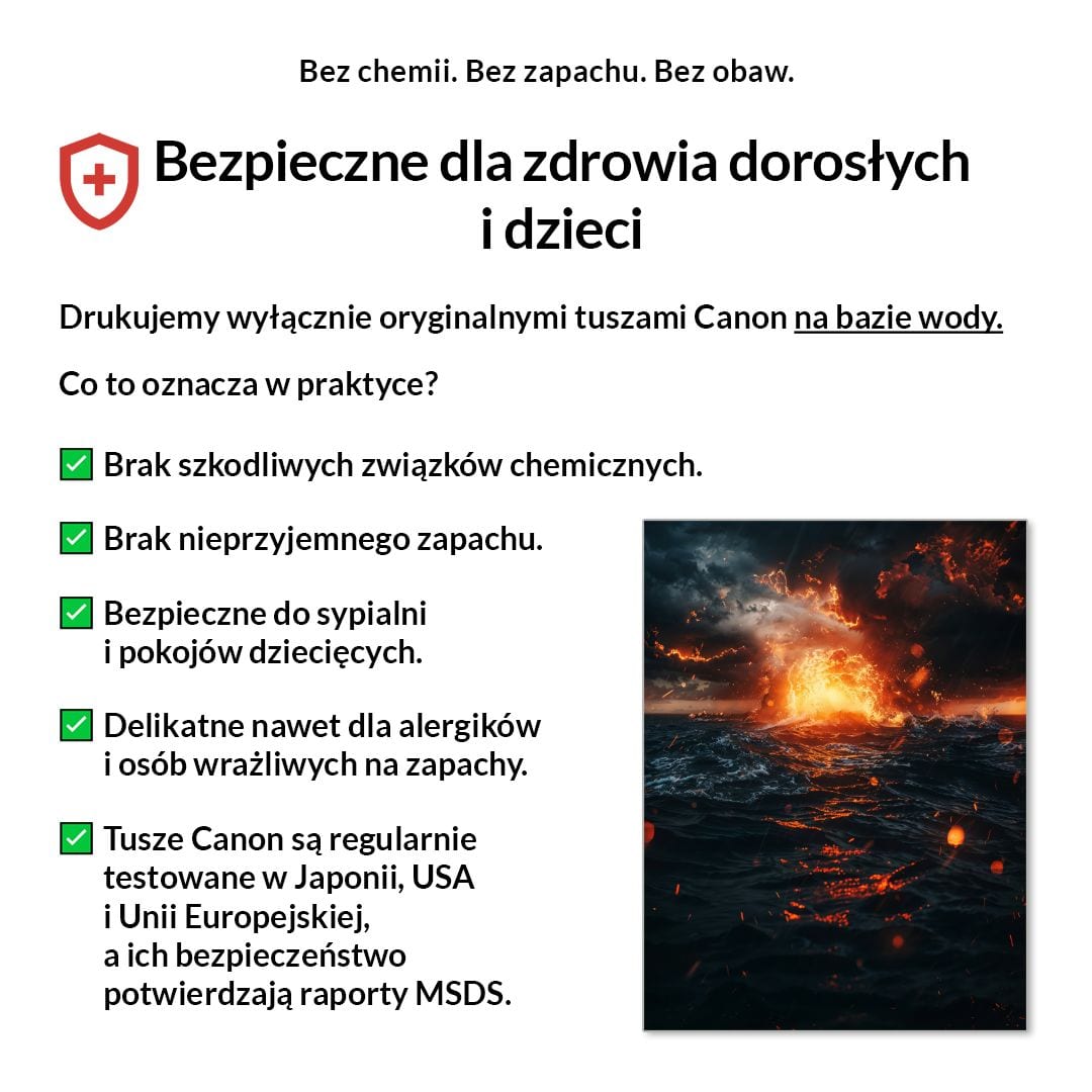 Tak, absolutnie! Drukujemy wyłącznie certyfikowanymi, bezwonnymi tuszami pigmentowymi Canon Lucia Pro na bazie wody. Są one w pełni bezpieczne dla zdrowia, nie zawierają rozpuszczalników i mogą być bez obaw stosowane w sypialniach i pokojach dziecięcych.