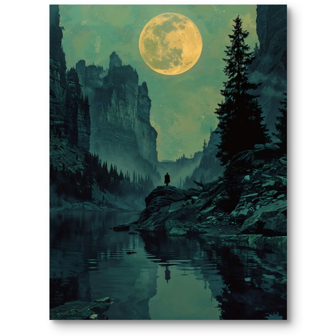 Plakat przedstawia niezwykle klimatyczny, tajemniczy krajobraz górski o zmierzchu. W centrum kompozycji ulokowana jest lśniąca pełnia księżyca, subtelnie rozświetlająca monumentalne, strome klify po obu stronach. Na pierwszym planie widzimy sylwetkę samotnego człowieka stojącego na kamieniu nad spokojnym lustrem jeziora, otoczonego ciemnymi, gęstymi lasami iglastymi.