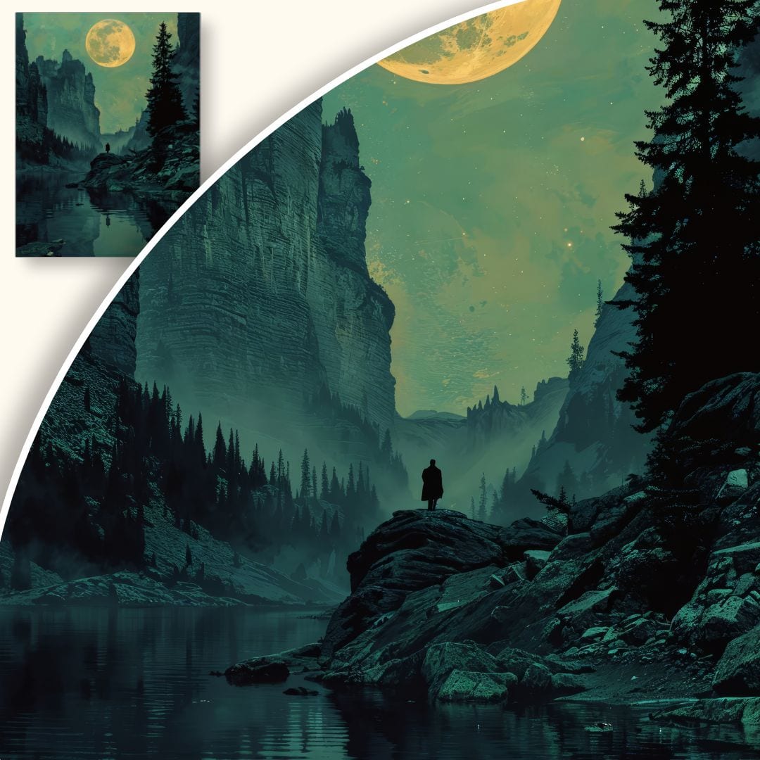 Plakat tchnie mrokiem i tajemniczością. Osamotniona postać stoi w konfrontacji z majestatyczną naturą pod czujnym okiem księżyca – to metafora refleksji nad miejscem człowieka w wszechświecie i potęgą przyrody, wzmacniająca romantyczny klimat zadumy oraz kontemplacji.