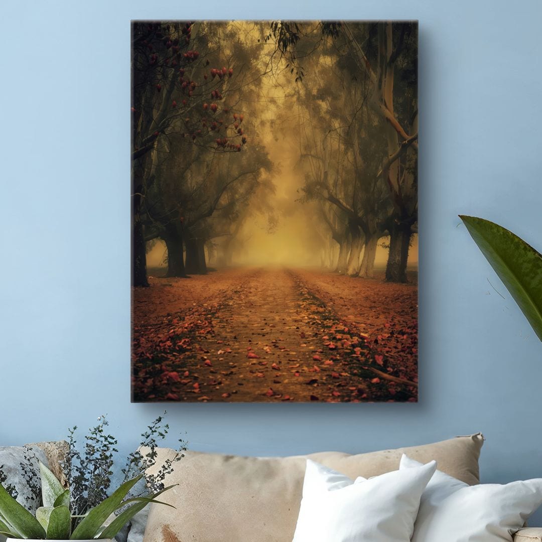 Plakat prezentuje malowniczy, jesienny krajobraz z leśną ścieżką tonącą w delikatnej mgle. Pomarańczowe korony drzew tworzą niezwykłą atmosferę, która zaprasza do zanurzenia się w naturze. Mgła dodaje scenie aurę tajemniczości, przekształcając plakat w niezwykle ekspresyjny i głęboki obraz przemijających pór roku.
