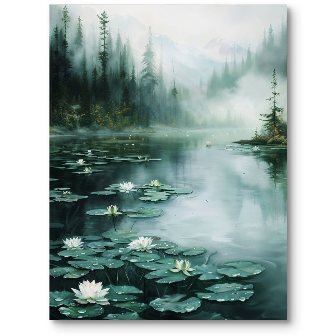 Plakat przedstawia malownicze jezioro otoczone imponującymi świerkami, delikatnie zanurzone w kojącej mgle. Na tafli wody unoszą się eteryczne lilie wodne, które tworzą harmonijną symfonię z naturalnym krajobrazem. W tle dostrzec można wysokie, tajemniczo zamglone góry, wprowadzające aurę mistycyzmu i głębi. Całość kompozycji emanuje spokojem oraz zachęca do zanurzenia się w pięknie dzikiej przyrody.