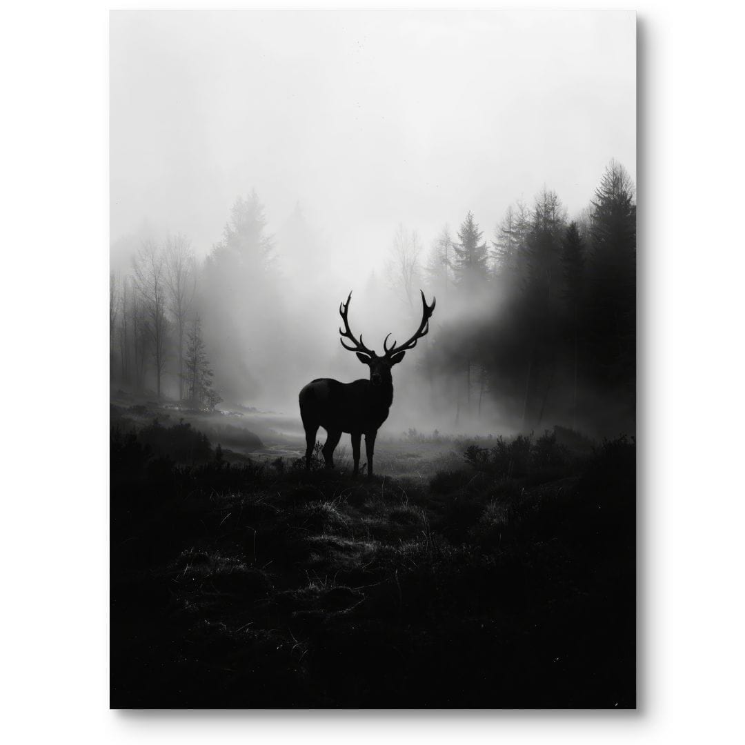 Mroczny, tajemniczy klimat uzyskany dzięki czarno-białym tonacjom i głębokim cieniom wprowadza refleksyjność. Jeleń, jako symbol siły, wolności i harmonii, uosabia niepokojącą, ale fascynującą więź człowieka z dziką przyrodą. To plakat idealny do stworzenia nastrojowej, wyciszającej przestrzeni.