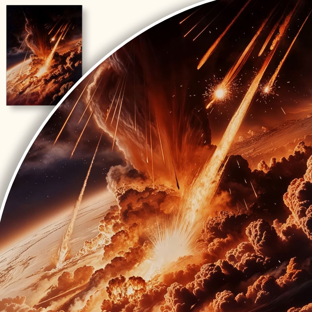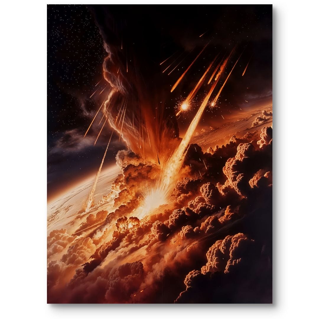Plakat ukazuje spektakularną scenę kosmicznej eksplozji – ogniste meteoryty przebijają się przez atmosferę, uderzając z olbrzymią siłą i wywołując wybuch na powierzchni planety. Ta pełna energii kompozycja oddaje moc i nieprzewidywalność wydarzeń w ogromie wszechświata. Intensywny pomarańcz ognia kontrastuje wyraziście z głęboką czernią kosmosu, wzbogacony bielą atmosferycznych zawirowań.