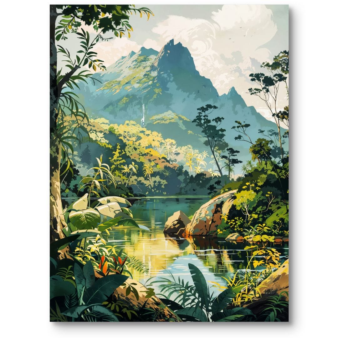 Centralnym elementem kompozycji jest majestatyczny szczyt górski, dominujący nad krajobrazem oraz przyciągający uwagę odbiorcy. Wokół niego rozpościera się soczysta zieleń roślinności i płynąca rzeka, które wspólnie budują harmonijną całość. Mieszane tonacje barw – od chłodnych błękitów i zieleni po ciepłe akcenty żółtego – nadają przestrzeni głębi i energii. Gra światła podkreśla każdy fragment pejzażu, dodając mu trójwymiarowego efektu i wyjątkowego dynamizmu.